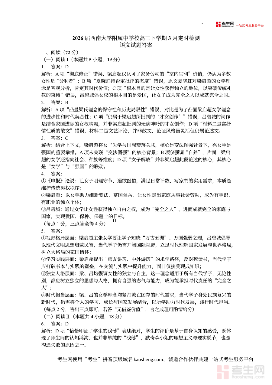 该资料适用于2026届西南大学附属中学的高三学生及相关语文教师。对于学生而言,它有助于规范答题思路、提升答题准确性;对于教师而言,它能简化阅卷流程、优化教学策略。在高三下学期3月这一备考关键阶段,该资料的使用能帮助师生更好地把握复习节奏,推进备考进程,为后续的高考冲刺奠定基础。