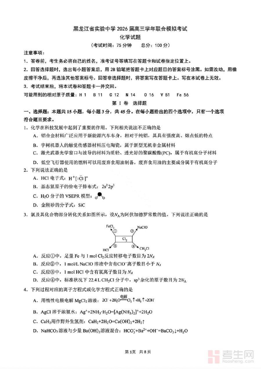 本试卷适用于黑龙江实验中学及参与本次联合模拟考试的2026届高三学生群体。作为高三学年关键时期的重要检测工具,它不仅能帮助学生熟悉高考化学考试整体流程与要求,提升应试技巧与时间管理能力;还能为学校和教师制定科学合理的备考规划提供数据支撑,助力构建更具针对性的复习方案。对于学生而言,合理利用该试卷进行练习与深度分析,可有效巩固已学知识体系,强化化学学科思维能力,为高考化学学科取得理想成绩奠定坚实基础。
