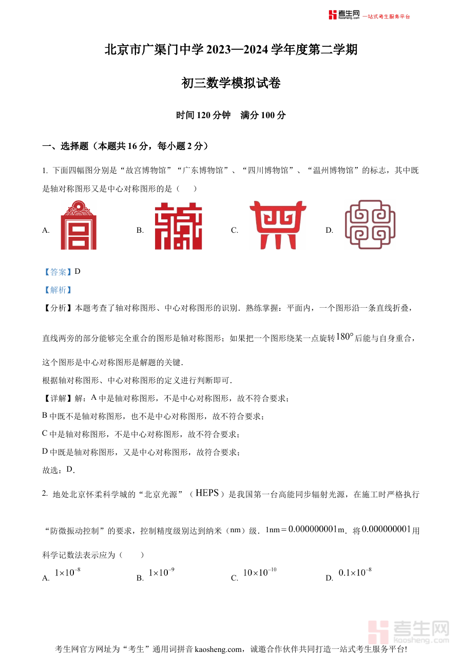 《精品解析:2024年北京市广渠门中学中考二模数学试题(解析版)》是针对2024年北京市广渠门中学初三学生中考二模阶段的数学学科备考资料。该资料对应中考前关键的模拟检测环节,能够反映出本校二模考试的命题方向与考查重点,为考生提供贴合本校教学实际和北京中考要求的参考内容。作为解析版资料,它不仅承载试题本身的呈现功能,更注重对解题思路和方法的系统梳理,帮助使用者深入理解考试中的核心考点与命题逻辑。