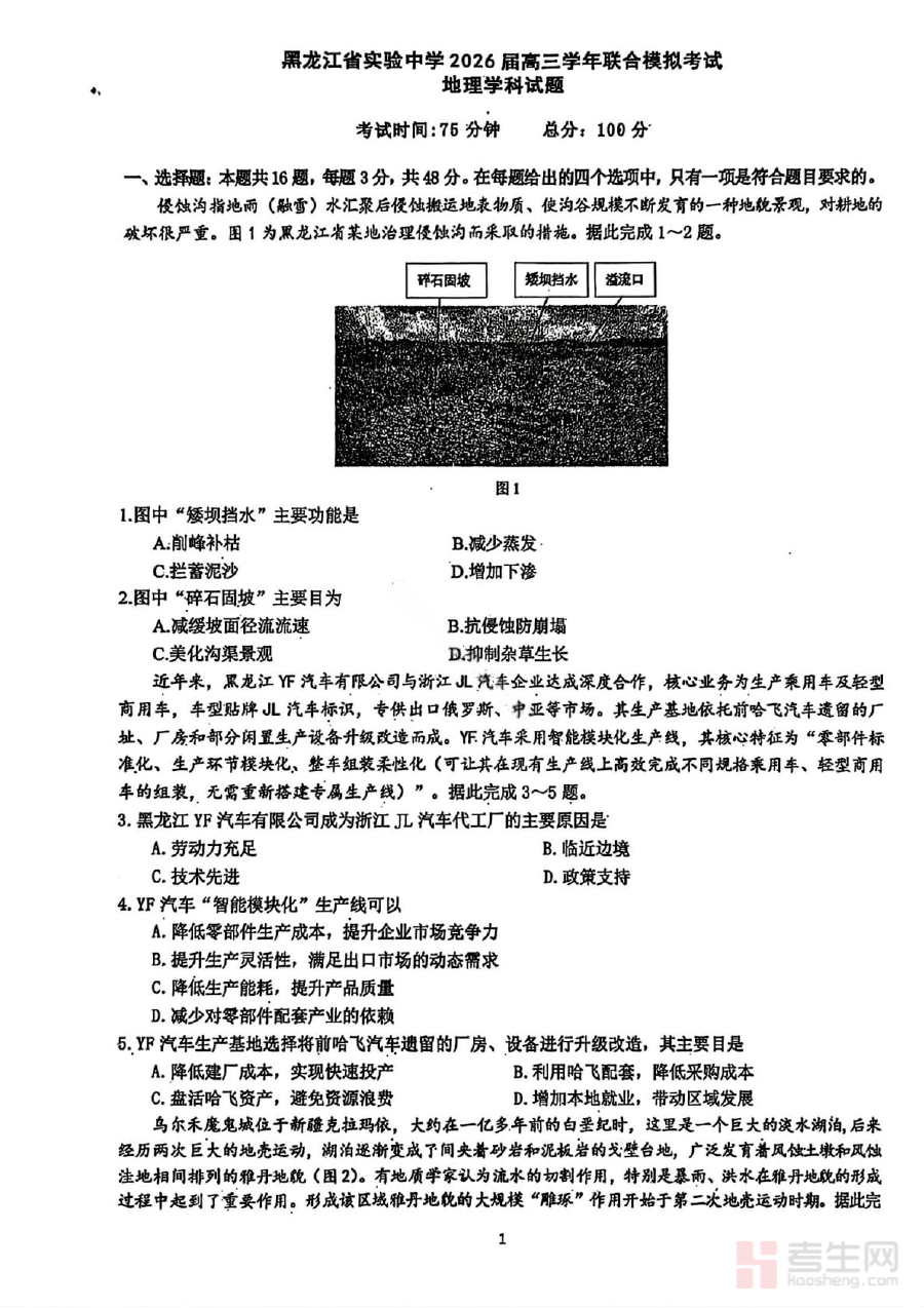 本试卷适用于黑龙江实验中学2026届高三学生、地理学科教师及相关教育工作者。对于学生而言,完成试卷可提升应试技巧与时间把控能力;对于教师,可借助试卷结果优化教学方案与复习计划;对于教育工作者,该试卷也可作为研究区域高三地理教学及模拟考试设计的参考素材,助力提升教学质量与备考效率。