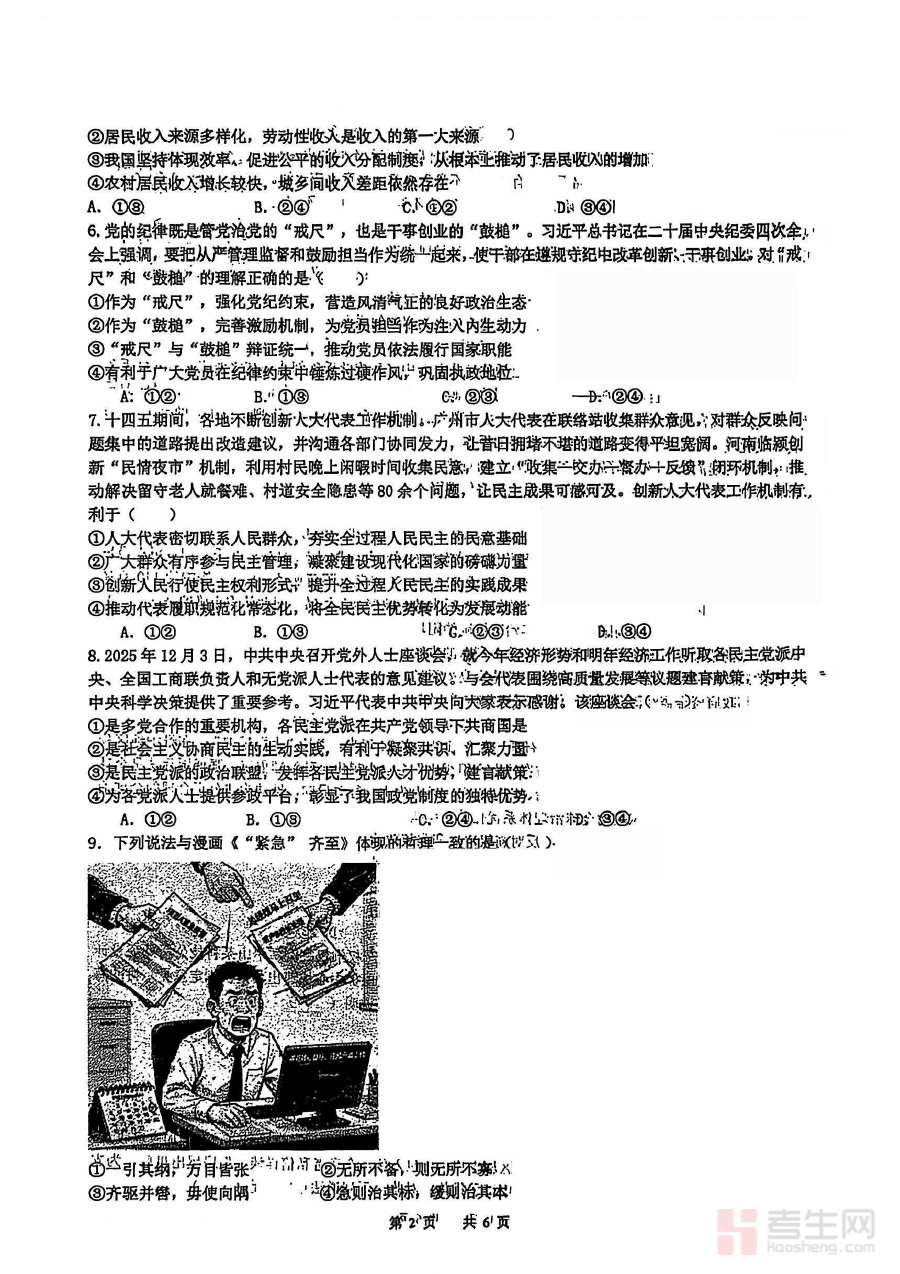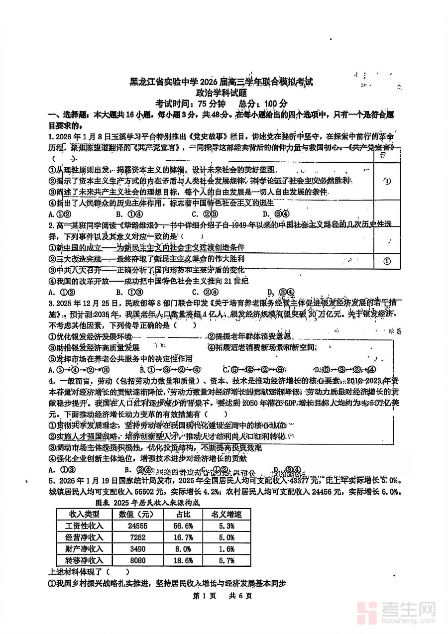 《政治试卷-黑龙江实验中学2026届高三学年联合模拟考试》是针对黑龙江地区实验中学2026届高三学生设计的政治学科联合模拟考试资料,属于高三阶段关键的备考资源之一。该试卷依托黑龙江实验中学及联合参与学校的教学经验与备考方向,能够较为全面地反映高三学生在政治学科上的阶段性学习状态,为后续复习环节提供清晰的参考依据,助力学生把握备考重点与方向。