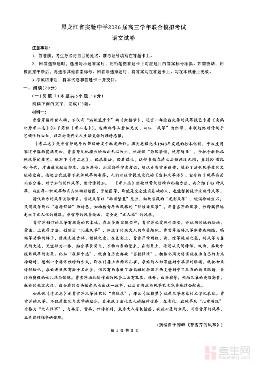 该试卷的核心适用人群为黑龙江实验中学2026届高三全体学生,同时也适用于黑龙江地区其他同阶段高三学生作为参考练习资料使用。参与此次联合模拟考试不仅能帮助学生巩固已学知识体系,还能提升应试技巧与时间管理能力,为即将到来的正式考试做好充分准备,具有重要的阶段备考价值,助力学生在后续学习中更有针对性地提升语文综合素养。