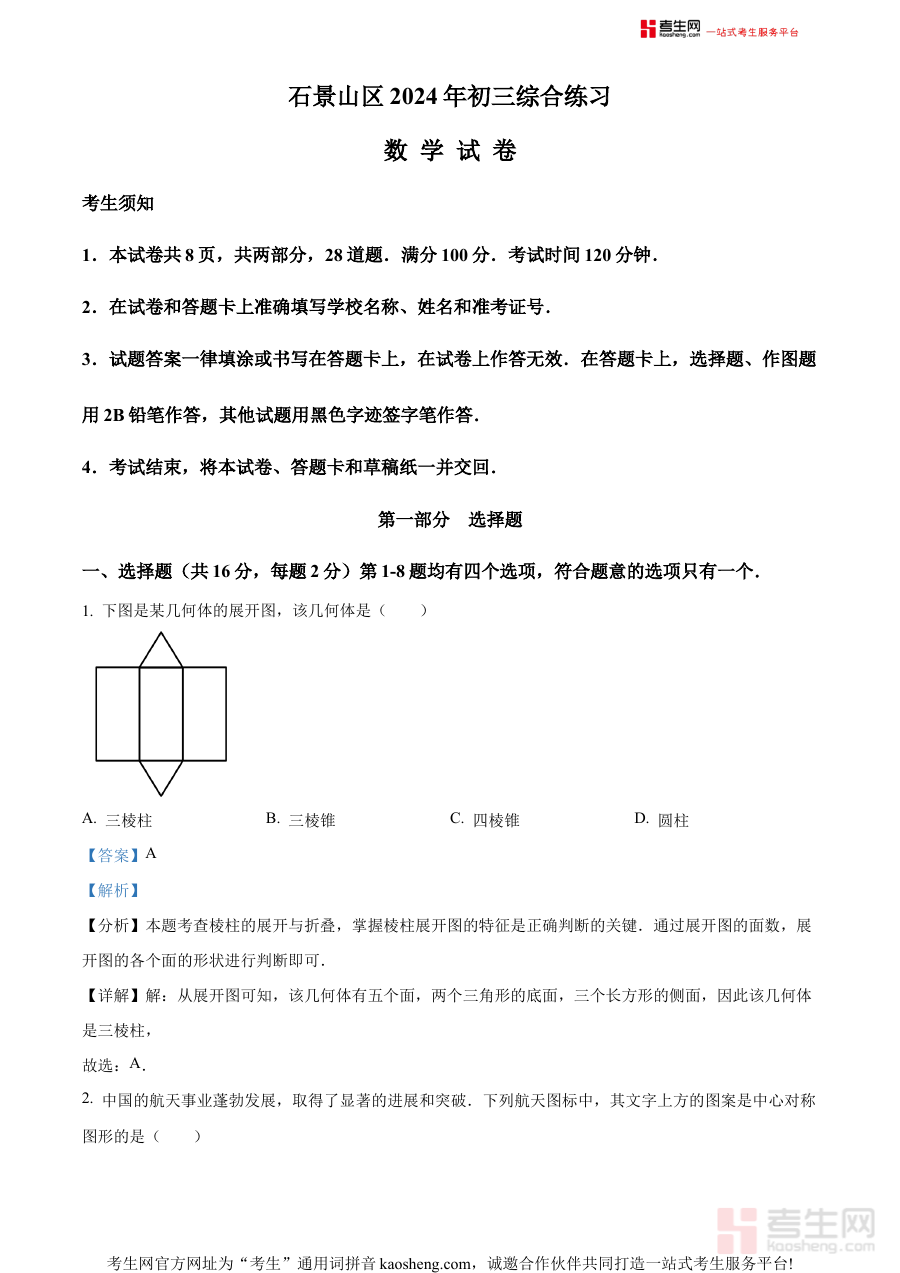 《精品解析:2024年北京市石景山区中考二模数学试题(解析版)》是针对2024年北京市石景山区初中毕业升学第二次模拟考试数学科目的专业备考资料。作为中考前关键的阶段性模拟测试,二模考试在考生知识体系梳理、考试节奏适应及备考方向调整中占据重要位置,该解析版整合了本地二模考试的核心元信息,为考生和教学工作者提供与石景山区中考命题趋势紧密相关的参考内容,助力使用者精准对接本地中考备考需求。
