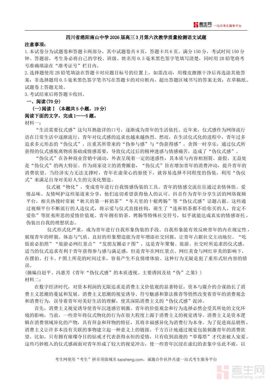 《四川省绵阳南山中学2026届高三第六次教学质量检测语文试题(含答案)》是四川省绵阳南山中学面向2026届高三学生开展的第六次教学质量检测的语文科目试题及配套答案资料,属于高三阶段重要的阶段性教学评估资源,为师生提供该阶段语文学习成效的直观参考。