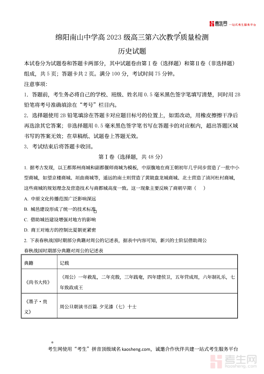 《精品解析:四川省绵阳南山中学2025-2026学年高三下学期第六次教学质量检测历史试题(原卷版)》是针对四川省绵阳南山中学2025-2026学年高三下学期第六次教学质量检测的历史学科备考资料,聚焦该阶段的教学质量检测需求,为高三学生提供贴合校考实际的历史试题原卷参考。