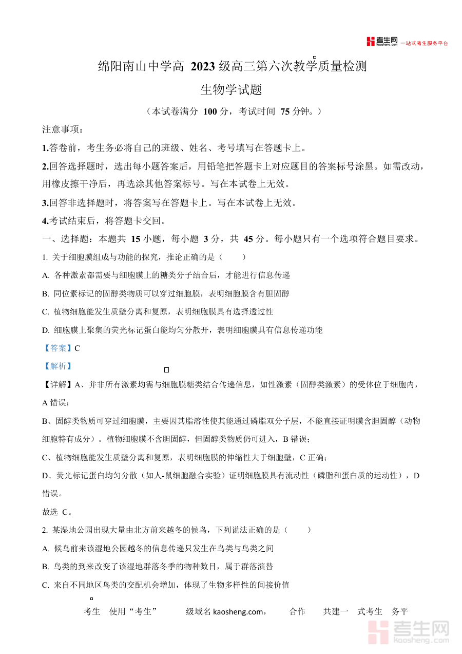 本资料主要适用于2026届四川省绵阳市涪城区及绵阳南山中学的高三生物学科师生,也可为其他同阶段关注生物学科备考的学习者提供参考;其解析内容有助于强化阶段检测的反馈效果,助力师生更科学地制定备考规划,提升备考效率与针对性。