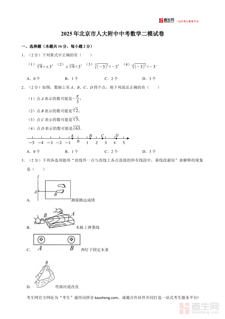 本试卷适用于2025年北京市中考数学科目的备考学生,尤其是需要通过阶段性检测明确复习方向的考生群体。其命制结合本地教学实际与中考命题导向,能帮助考生在复习关键阶段强化备考针对性,提升复习效率与应试信心。
