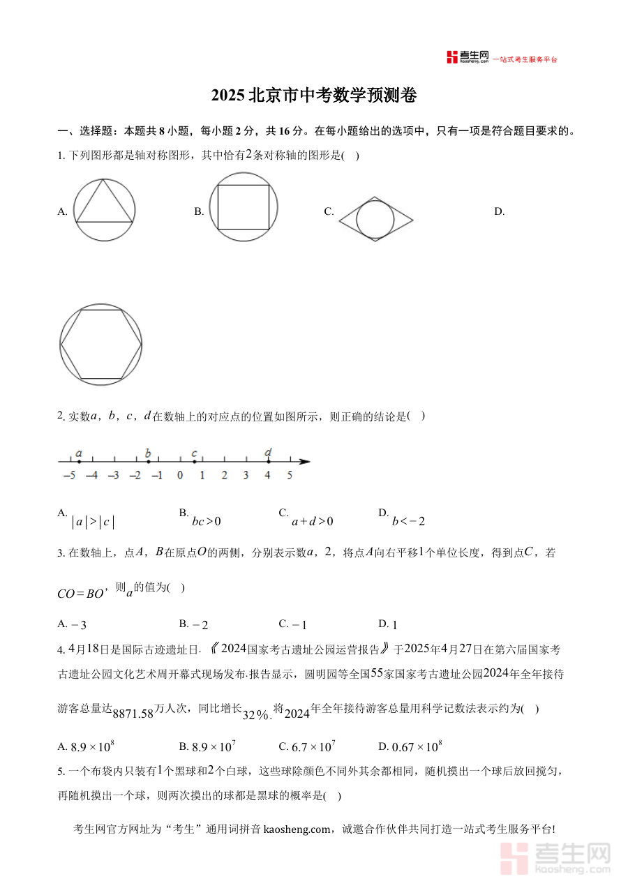 本资料主要适用于2025年即将参加北京市中考的九年级学生,以及承担初中数学教学任务的教师群体。对于考生而言,使用该预测卷能提前感知考试难度与命题风格;对于教师而言,可借助其优化教学内容与指导策略,提升备考指导的针对性与有效性。