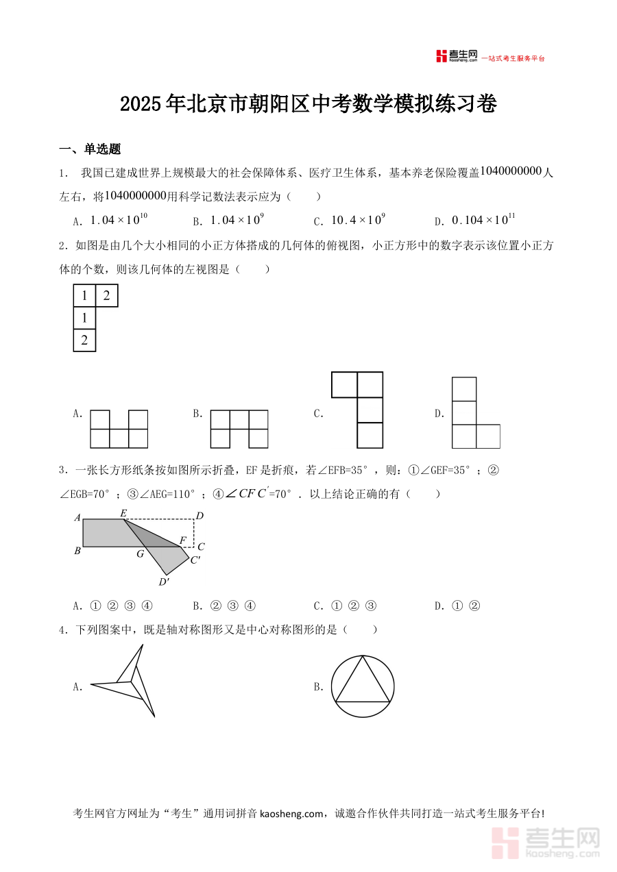 本练习卷适用于北京市朝阳区2025届初中毕业生及初中数学教师,对于学生而言,通过练习可提升应试能力与答题节奏把控能力;对于教师而言,可借助该资料优化教学计划与备考指导方案,增强教学的针对性与有效性,助力学生高效完成中考数学备考任务。