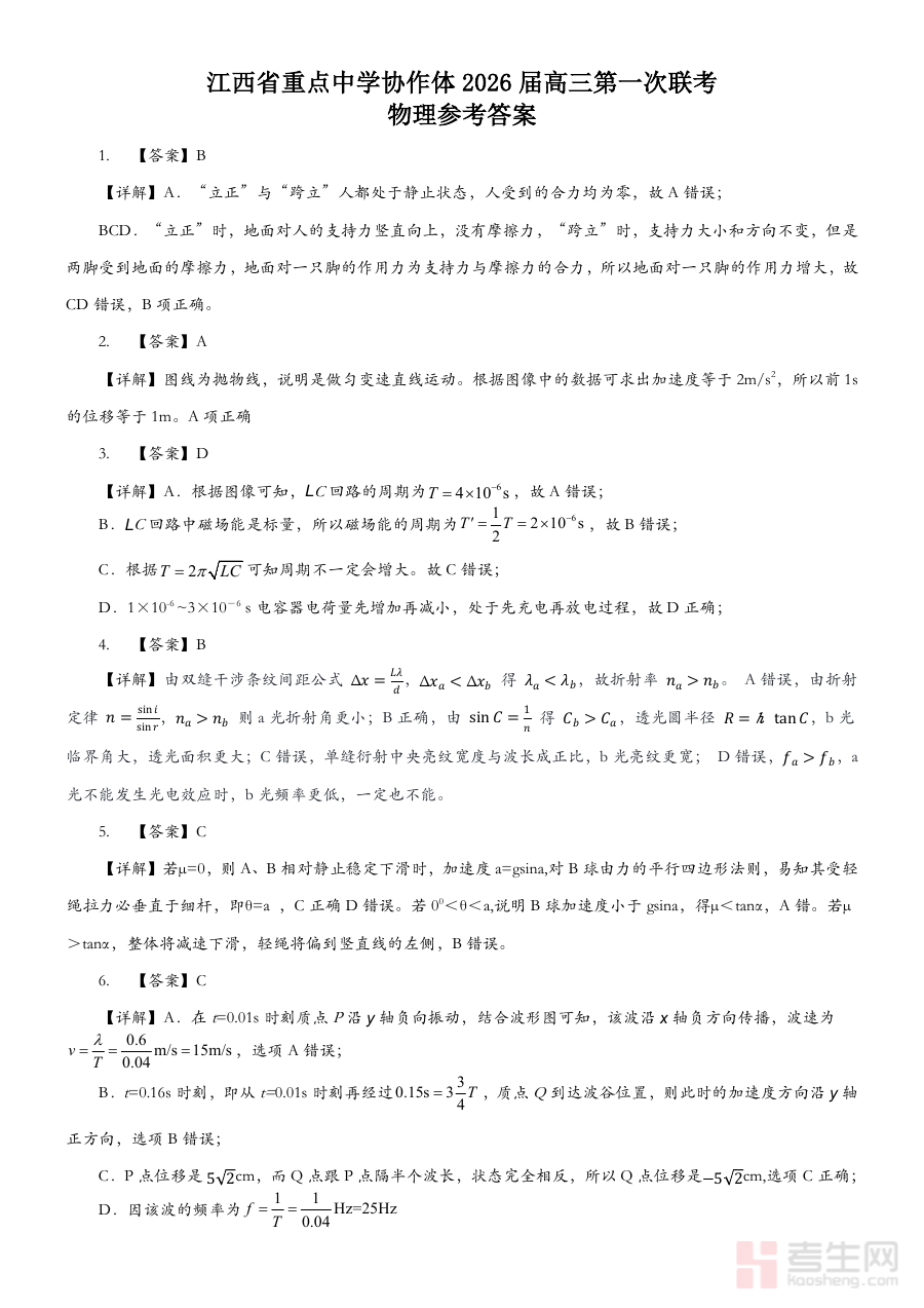 《江西重点中学协作体2026届高三第一次联考物理答案》是针对江西省重点中学协作体组织的2026届高三学生第一次联考物理科目的配套答案资料。该资料依托江西地区重点中学协作体的联考体系,与高三阶段首次综合性物理考试相匹配,为考生和教学人员提供对应考试的权威参考依据。