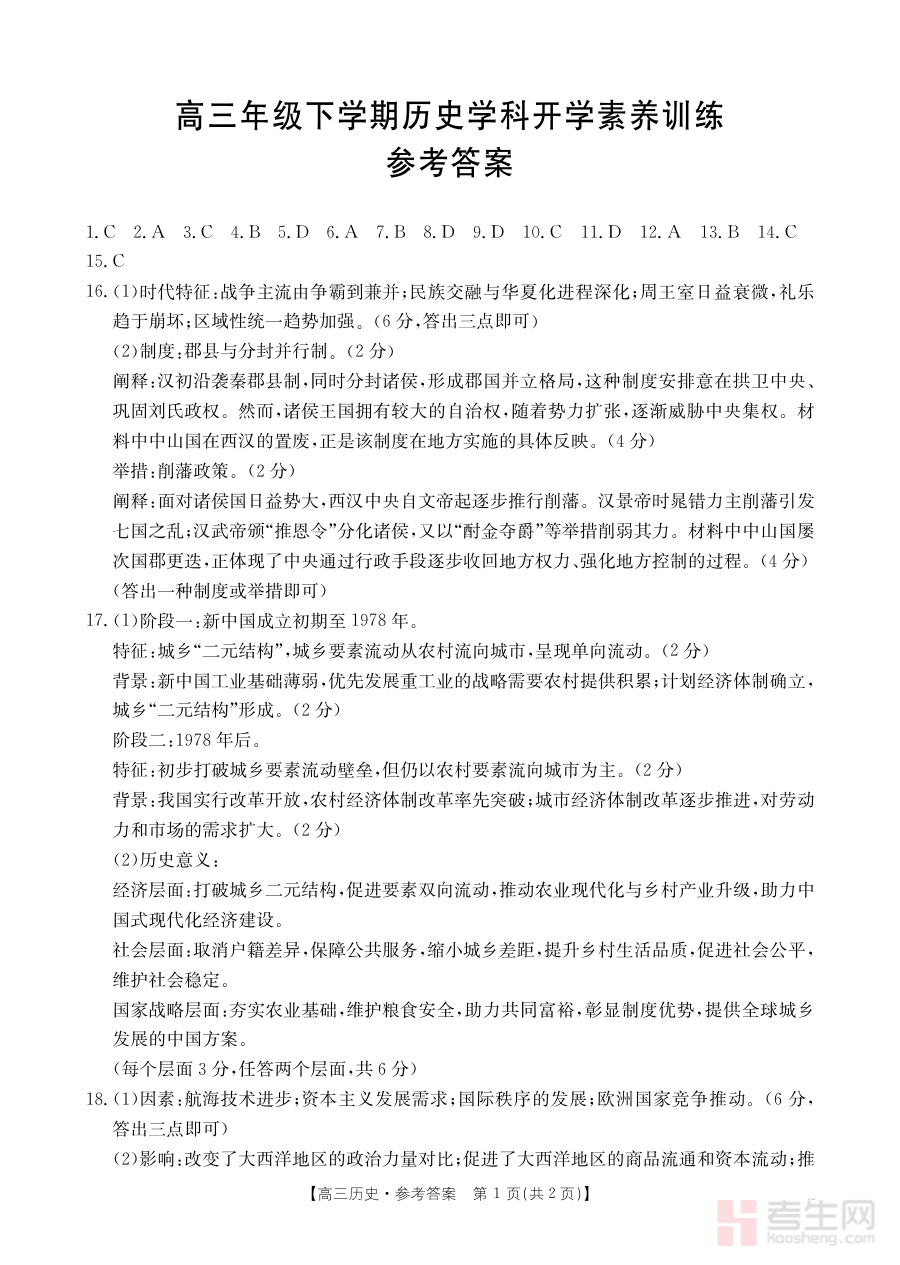 作为高三下学期开学初期的素养训练答案,该资料能够帮助使用者快速核对训练结果,清晰了解历史知识的掌握程度与应用能力水平,为后续的备考规划提供精准的数据支持与方向指引,助力师生及时发现复习中的问题并调整策略,增强阶段复习的针对性与有效性。