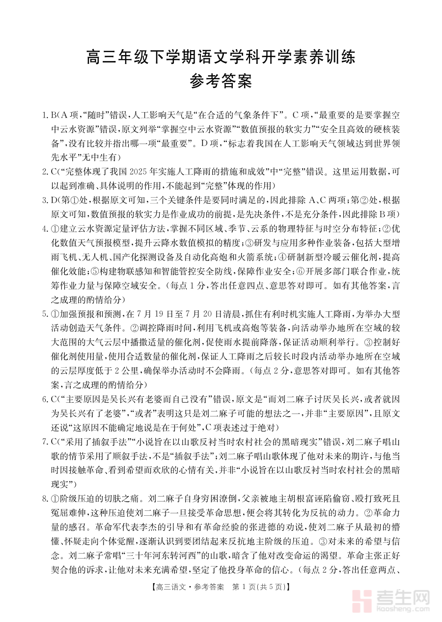 该资料可用于核对开学素养训练的完成情况并进行针对性分析,帮助师生明确当前语文学习中的薄弱点,为后续备考规划提供数据支持与方向参考,是高三下学期初期开展阶段检测与调整学习策略的重要工具。