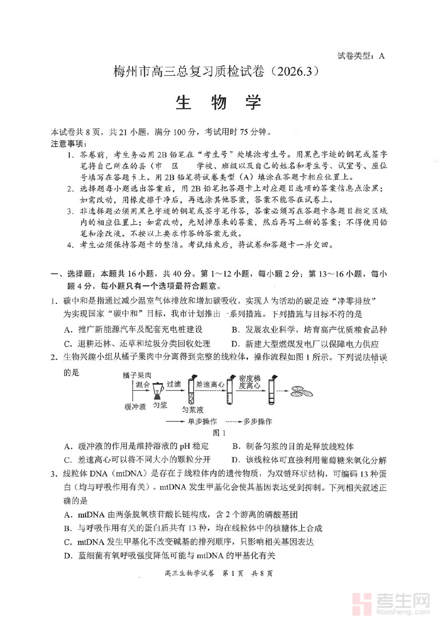 《广东省梅州市2026届高三下学期一模生物试题(含答案)》是面向广东省梅州市2026届高三学生推出的生物学科阶段性模拟考试资料,属于高三下学期关键的首次模拟测试范畴。该试题紧密结合当地高三生物教学进度与区域备考要求,旨在通过标准化模拟考试形式,帮助师生把握当前阶段的学习状况与学科能力水平,为后续系统备考提供重要参考依据。