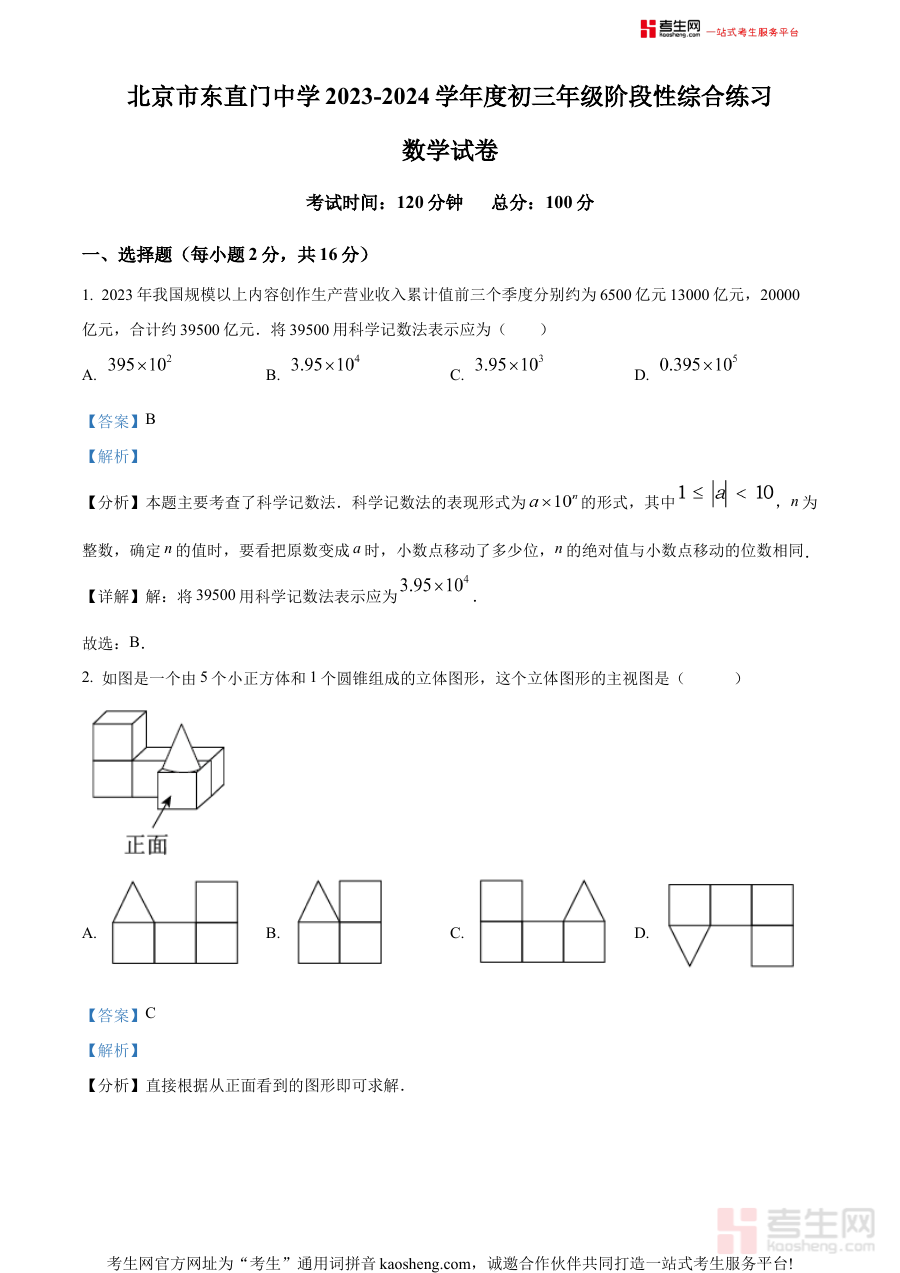 《精品解析:2024年北京市东直门中学中考三模数学试题(解析版)》是2024年北京市中考备考阶段的重要资料,由东直门中学针对中考数学学科推出的三模试题及配套解析版本。三模考试作为中考前的关键模拟环节,该资料紧密贴合北京地区中考数学的命题方向与本地教学实际,为考生提供了具有针对性的阶段性训练内容,帮助考生提前适应中考的考试节奏与题型特点。