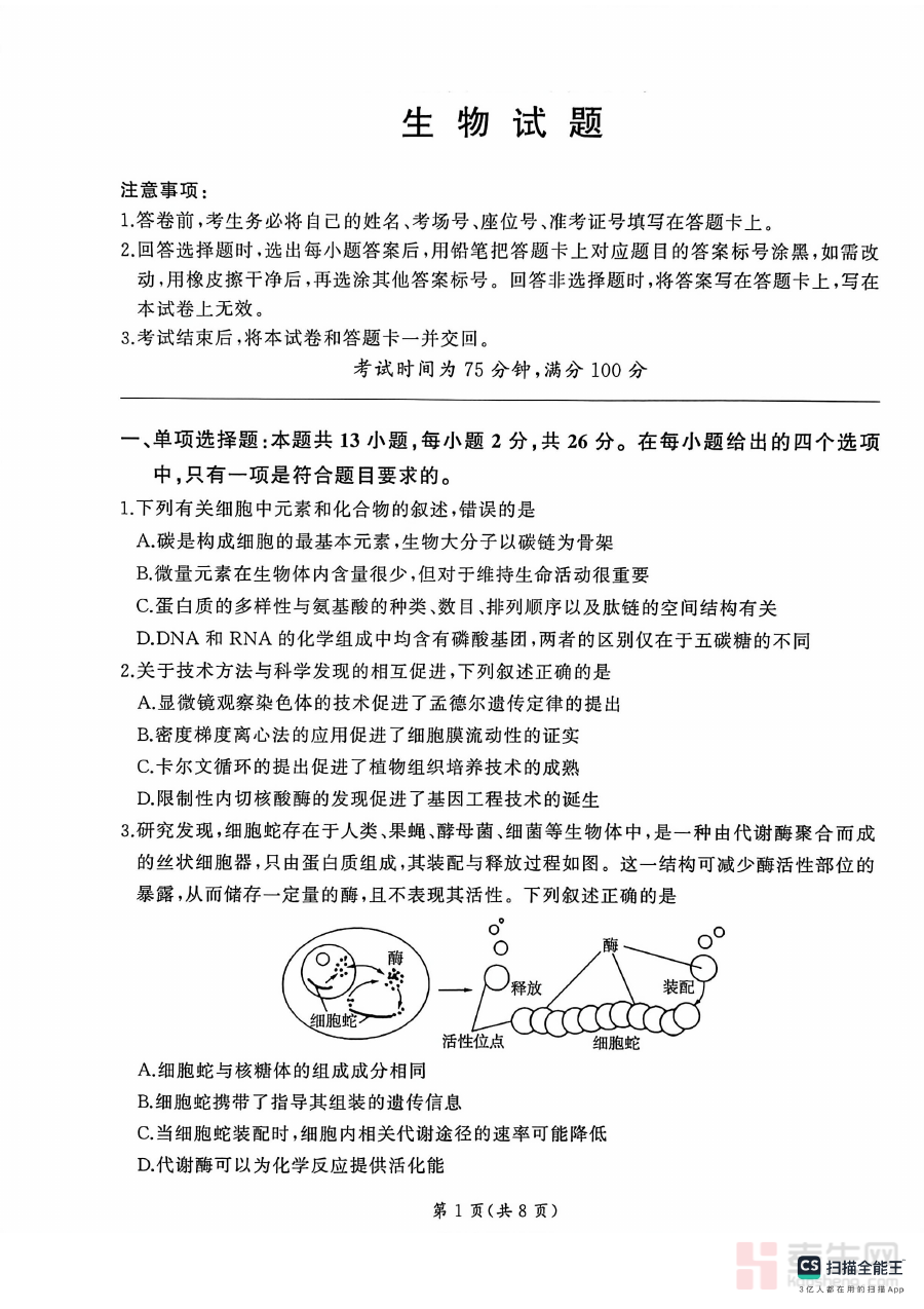 《2026届百师联盟高三下学期开年考生物试题》是面向2026届高三学生推出的生物学科阶段性考试资料,由百师联盟统筹命题,紧密结合高三下学期开年阶段的复习重点与学科能力培养目标,旨在为学生提供贴合该阶段学习进度的标准化检测内容。