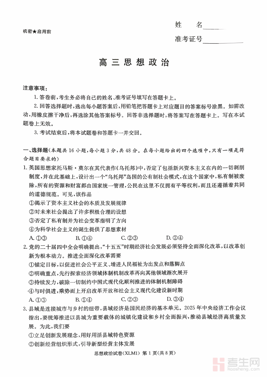 该资料可用于高三思想政治学科的阶段学情诊断,帮助教师了解学生当前备考阶段对知识的掌握情况,为后续备考规划的调整提供数据支持,同时让学生清晰认知自身学习短板,明确后续复习方向。