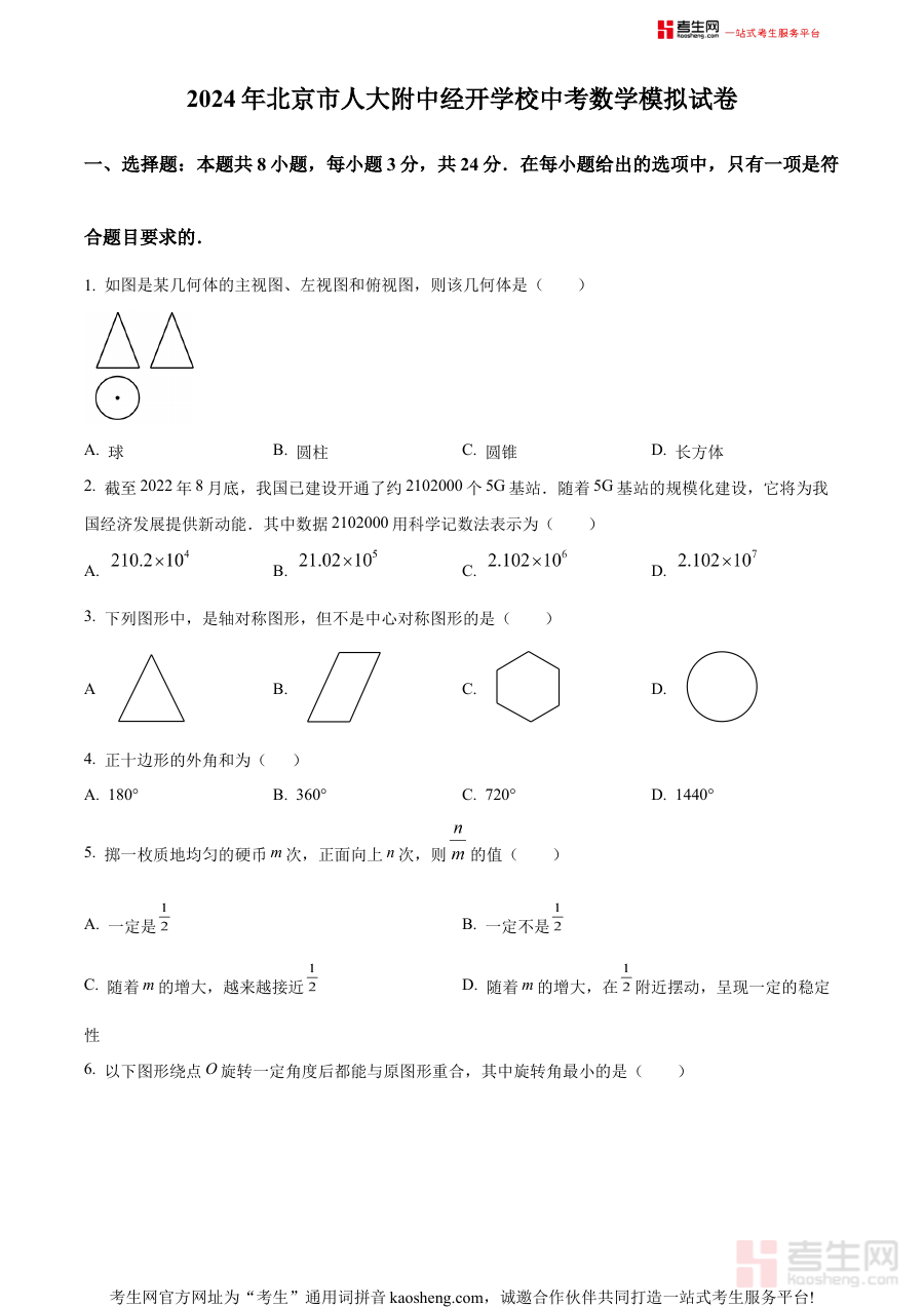 《精品解析:2024年北京市人大附中经开学校中考模拟数学试题(原卷版)》是2024年北京市针对中考数学科目的模拟备考资料,由人大附中经开学校编制。该资料结合北京地区中考数学的命题导向与该校教学特色,为初三学生提供贴近本地考试要求的模拟练习资源,帮助学生提前适应中考数学的考查模式与整体结构,是中考备考阶段的重要辅助材料之一。