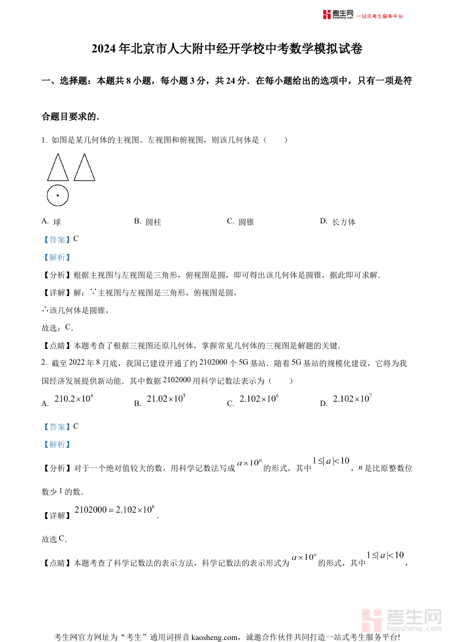 《精品解析:2024年北京市人大附中经开学校中考模拟数学试题(解析版)》是2024年北京市人大附中经开学校针对初中毕业年级学生编制的中考数学模拟备考资料,包含试题及对应解析内容。该资料依托学校的教学资源与命题经验,紧密贴合北京市中考数学的考查方向,为考生提供了具有针对性的模拟练习载体,能够帮助考生提前感知中考数学的考查形式与命题逻辑。