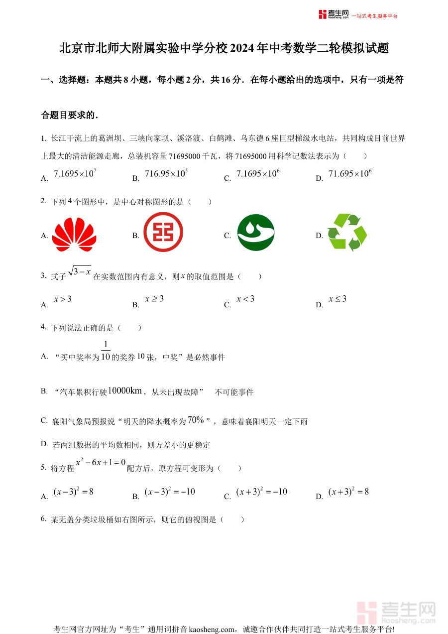 《精品解析:2024年北京市北京师范大学附属实验中学分校中考二模数学试题(原卷版)》是2024年北京市区域内,由北京师范大学附属实验中学分校编制的中考数学第二次模拟考试原卷类备考资料。它紧密贴合北京市中考数学的命题趋势与本地教学实际,依托学校优质教学资源对中考规律的把握,为考生提供符合区域学情的模拟训练载体,帮助考生提前熟悉中考二模考试的整体框架与考查方向。