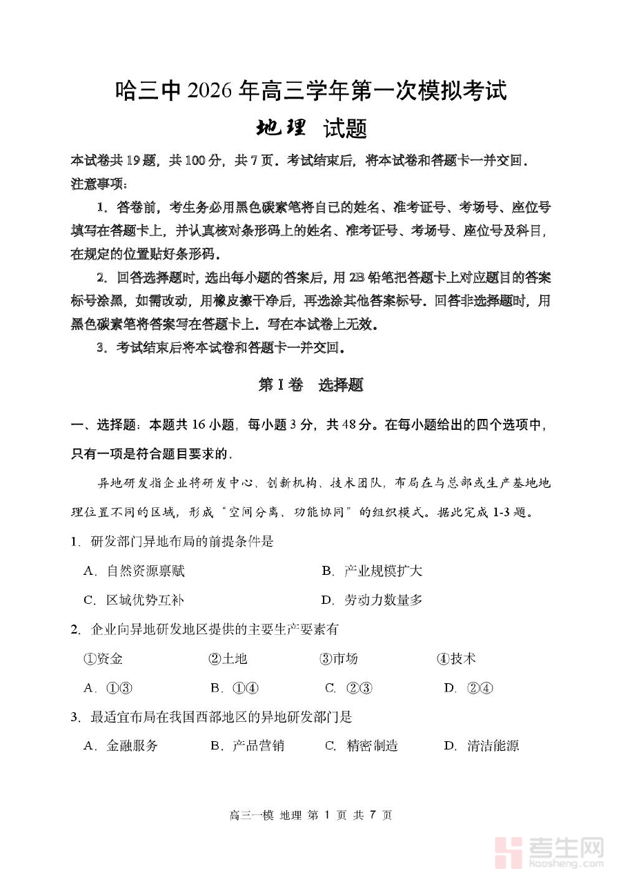此试卷主要适用于哈尔滨市第三中学2026届高三学生开展自我检测与备考训练,也可作为同地区其他高中高三地理教师的教学参考资源,其阶段性检测价值能够助力学生提前熟悉高考地理的考试形式与节奏,有效提升备考效率,为后续的系统复习与冲刺阶段做好准备。