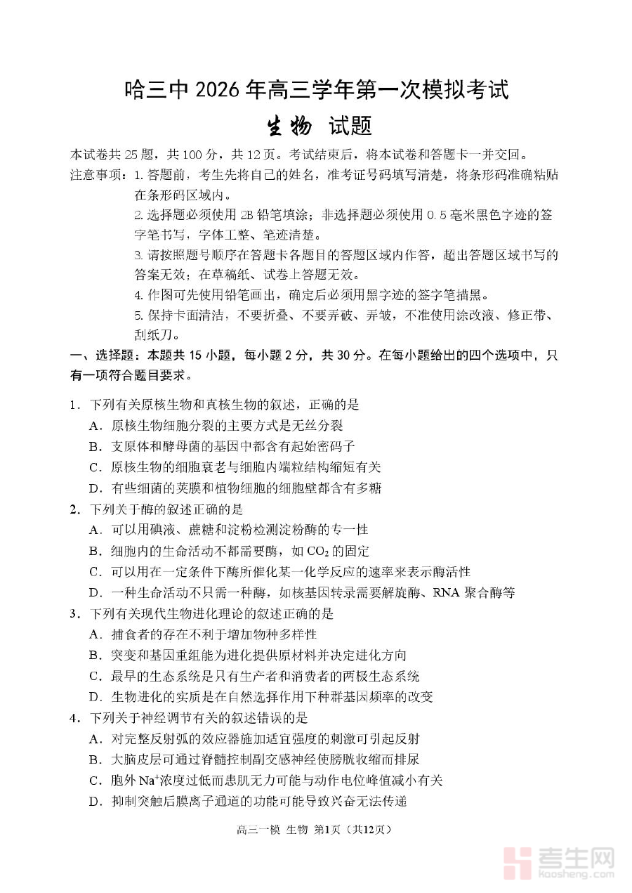 该试题适用于2026届哈尔滨市第三中学及同类学校的高三学生,尤其适合处于一轮复习关键阶段、需要通过模拟考试检验复习效果的学生群体。通过完成这份试题并分析结果,学生能清晰了解自身学习进度与水平,明确后续复习核心方向,增强应对高考生物考查的综合能力,对高三阶段备考规划具有重要指导价值。