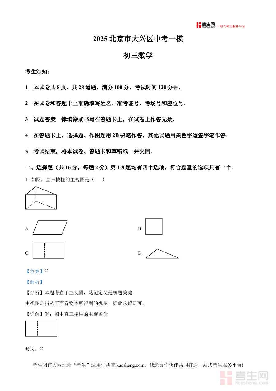 《精品解析:2025年北京市大兴区中考数学一模试卷(解析版)》是针对2025年北京市大兴区初中毕业生开展的中考数学第一次模拟考试的配套专业解析资料。该资料依托本地中考模考体系构建,聚焦区域中考数学备考的阶段性需求,为考生和教师提供与本地模考直接相关的解析支持,帮助使用者把握本次模考的整体框架与考查方向,是衔接日常学习与中考正式考试的重要过渡性资料。