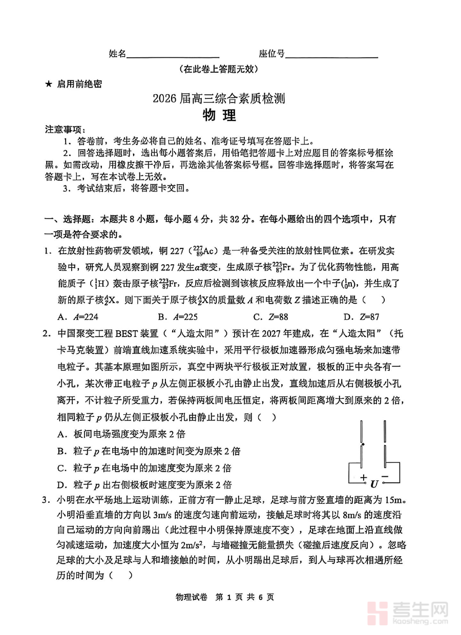 本资料适用于安徽省江南十校2026届高三学生及物理学科教师,作为开学阶段的物理学科检测工具,其价值在于帮助学生快速进入高三下学期备考状态,通过规范的考试形式模拟真实考场情境,同时为教师掌握学生开学初期的学习状况提供可靠参考,助力师生共同推进高效备考进程。