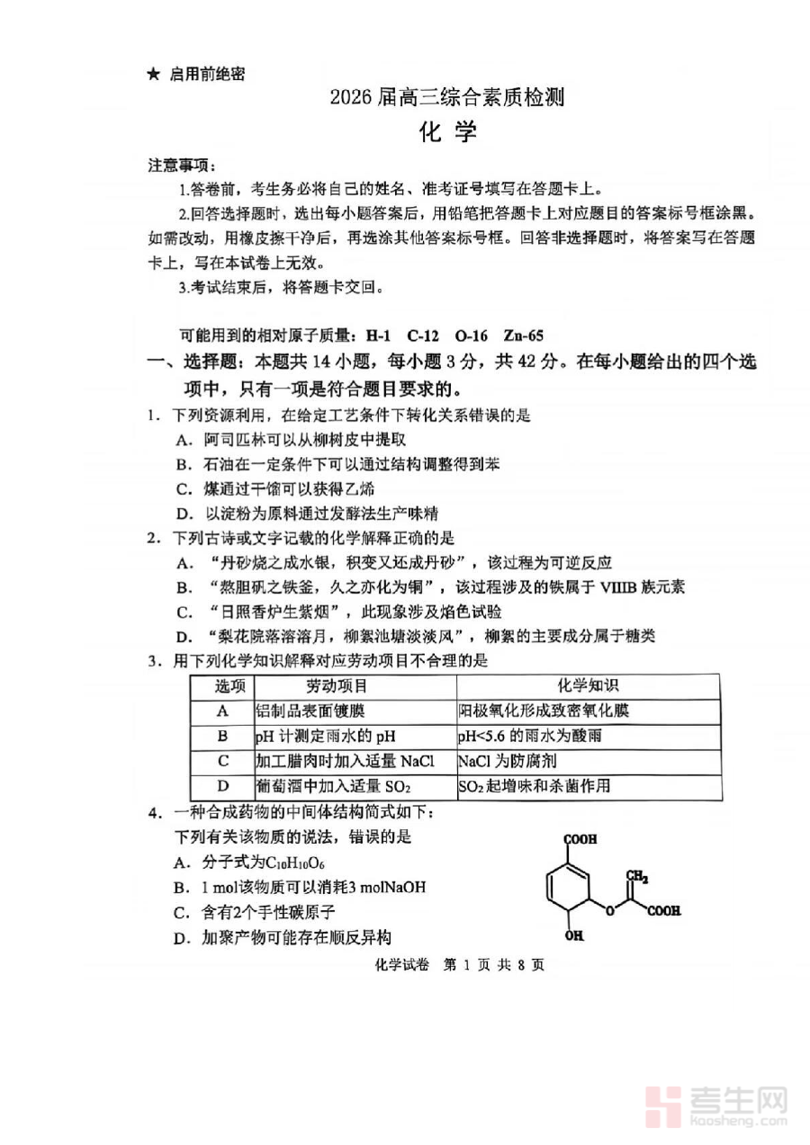 作为阶段性备考资料,该试卷可用于考生的学情诊断与自我评估,帮助使用者清晰识别化学学习中的优势与不足,为后续的备考规划提供客观依据;同时也能作为学校或教师开展阶段检测的参考素材,辅助教学团队了解学生的整体学习状况并调整教学策略。此外,通过完成该试卷,考生可提前熟悉区域联合考试的形式与要求,提升应试适应性。