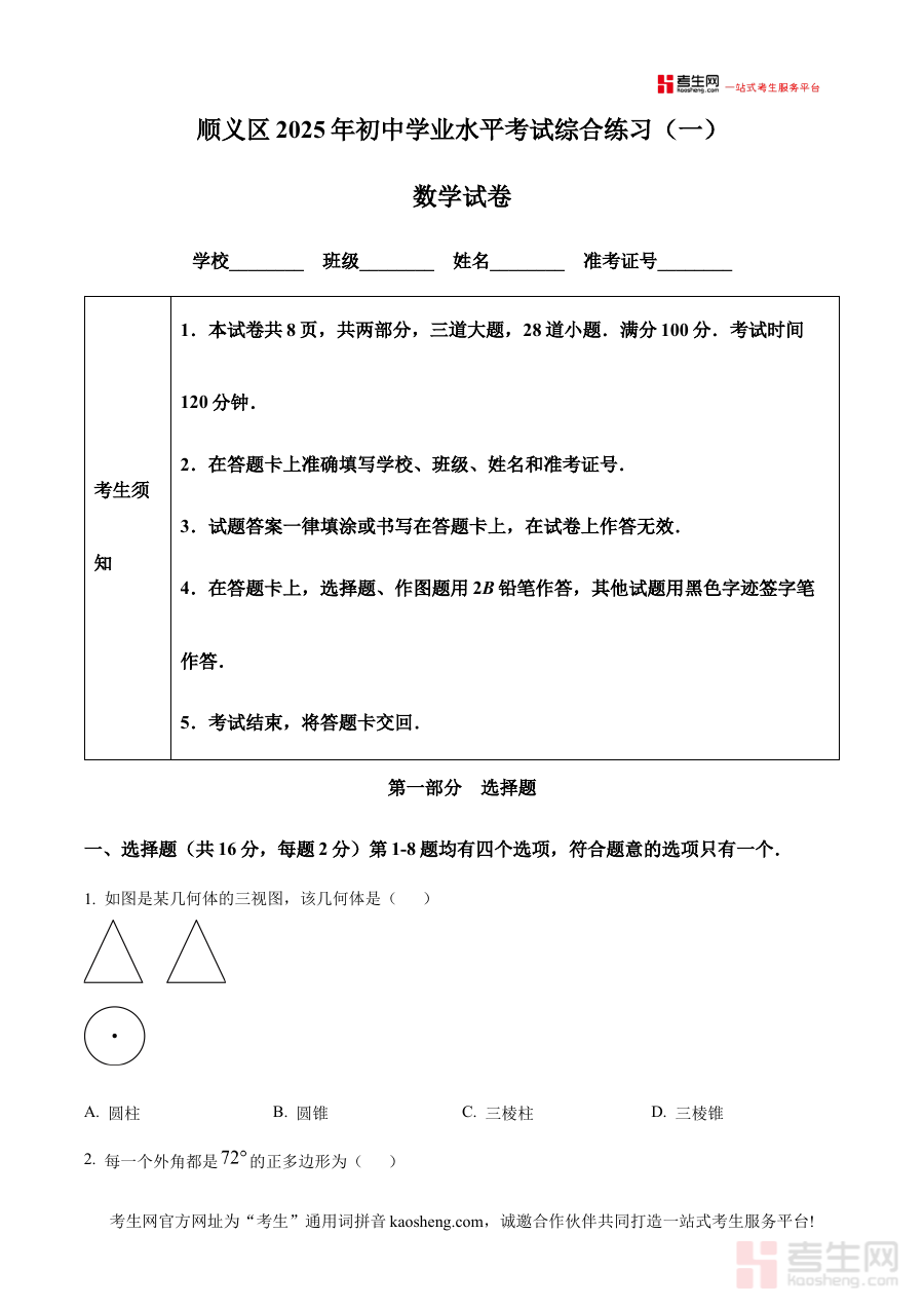 《精品解析:2025年北京市顺义区中考一模数学试卷(原卷版)》是针对2025年北京市顺义区初中毕业生开展的中考数学第一次模拟考试的原卷版本备考资料,精准反映该地区中考数学一模考试的命题方向与本地考情特点,为考生提供贴合区域考试要求的实战训练载体,帮助考生提前接触符合本地命题风格的考试内容形式。