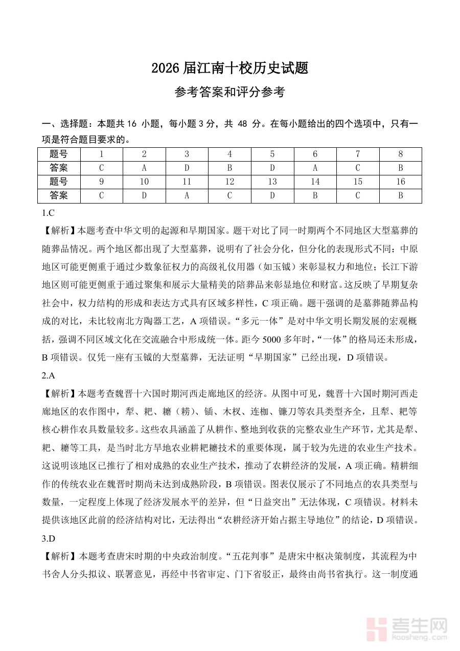 适用人群主要涵盖2026届安徽省江南十校的高三学生及历史教师。学生通过使用该答案能及时查漏补缺,优化历史学科的学习方法与答题技巧;教师则可利用其进行教学效果评估与后续备考计划制定。同时,该资料对其他同地区、同阶段的高三历史学习者也具有一定参考价值,有助于他们了解江南十校开学考试的考查特点与评分标准,提升备考的针对性和有效性。