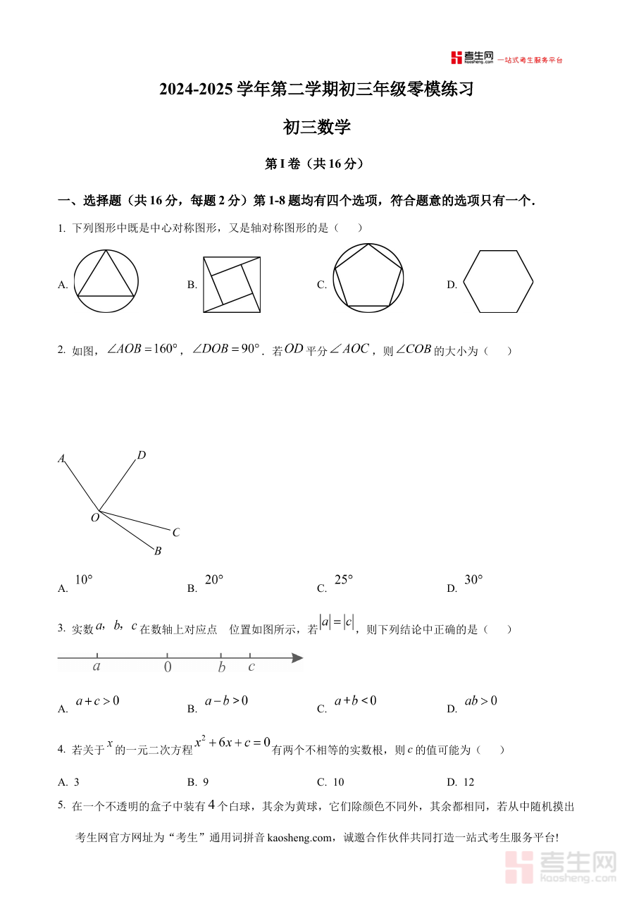 该试卷可用于考生开展自我学情诊断工作,助力考生及教师精准掌握当前阶段知识掌握程度与能力薄弱环节;同时能为后续备考规划提供数据支持,让考生针对性调整学习策略、合理分配复习时间与精力;此外其零模考试属性可帮助考生适应中考数学考试节奏与形式,提前进入备考状态,为后续系统复习奠定基础。