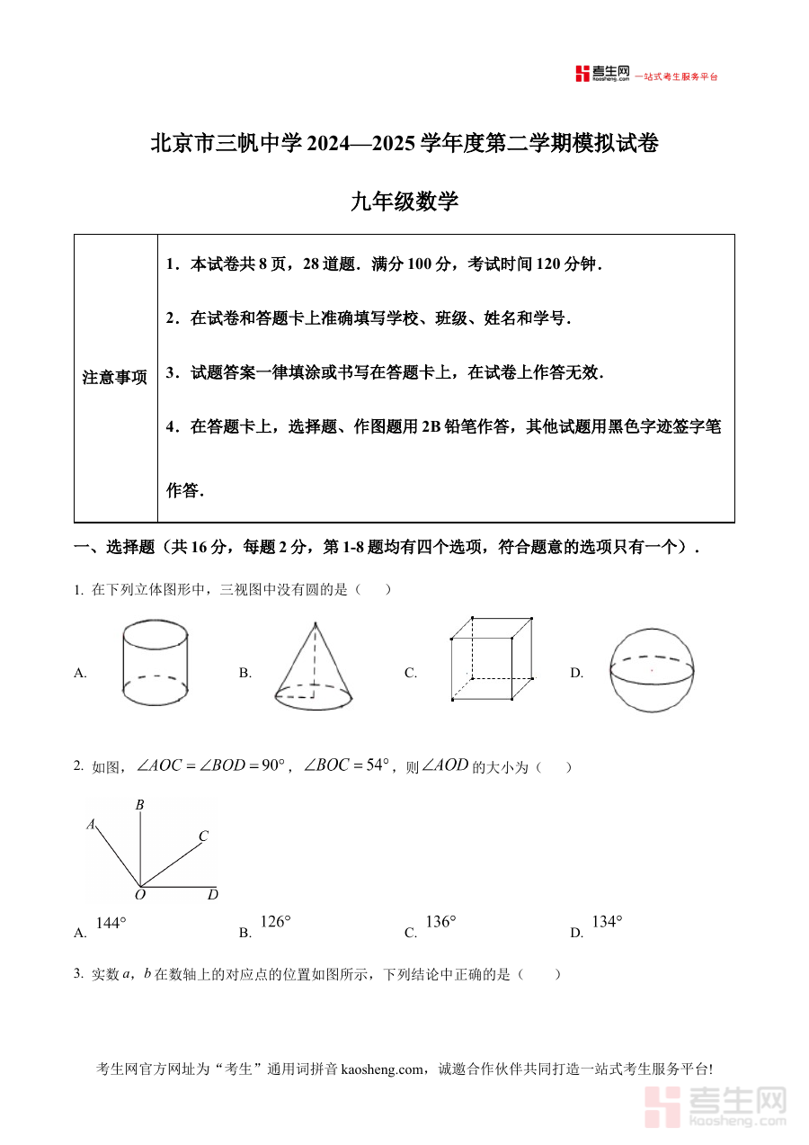 本资料主要适用于北京市三帆中学及北京地区其他同类学校的九年级学生,特别是处于中考备考起步阶段、需要明确复习方向的学生群体。借助这份零模试卷,学生不仅能检测当前的学习水平,还能通过对测试结果的分析优化个人备考策略;教师也可利用该试卷开展班级学情分析,为精准教学和个性化指导提供依据,从而共同提升中考数学备考的效率与质量。