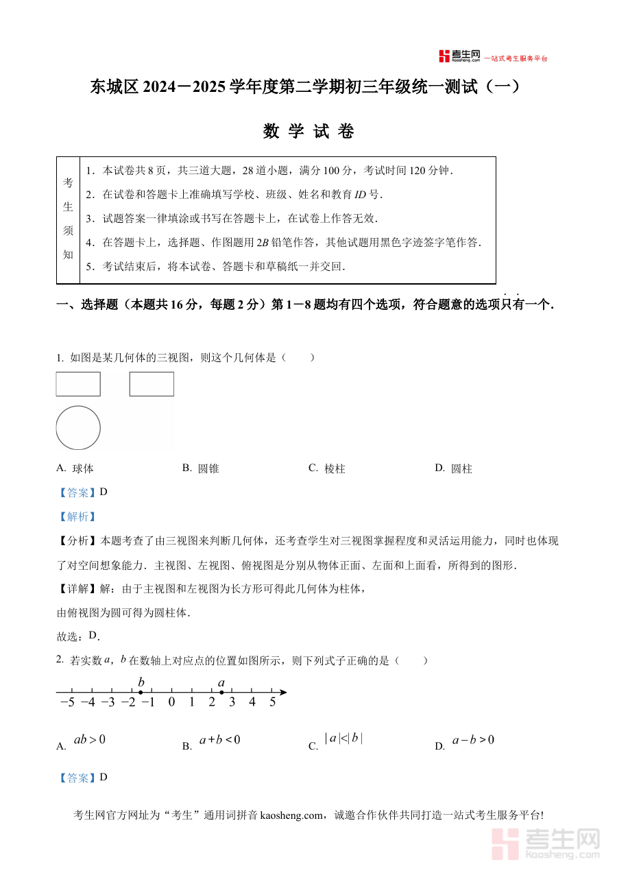 《精品解析:北京市东城区2024-2025学年下学期九年级一模数学试卷(解析版)》是针对北京市东城区2024至2025学年下学期九年级数学一模考试设计的备考资料。该资料贴合东城区区域教学实际与九年级下学期数学学科阶段性检测要求,为学生提供具有针对性的试卷解析内容。
