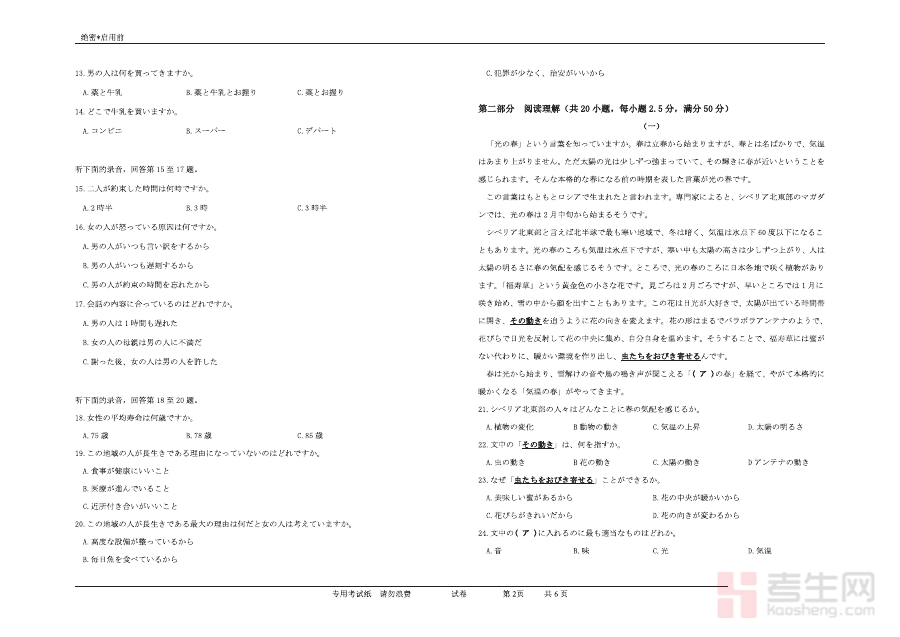 该试题的核心用途在于支撑高三日语学习的阶段检测与学情诊断工作。通过使用该试题,师生可系统掌握当前阶段日语学科的学习成效,精准定位学习过程中的薄弱环节,进而为后续的备考规划提供科学的数据支撑与方向指引;同时,它也能帮助师生及时调整教学与学习策略,优化备考路径,提升整体备考效率与质量,确保备考工作更具针对性和有效性。