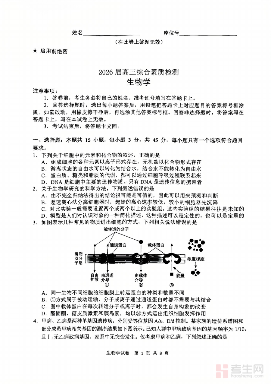 该试卷适用于安徽江南十校及同类型区域的2026届高三学生,尤其适合需要在开学阶段进行生物学科自我评估或教师开展班级学情分析的群体,其价值在于通过开学检测帮助师生精准定位复习重点,提升高三下学期生物备考的针对性与效率。