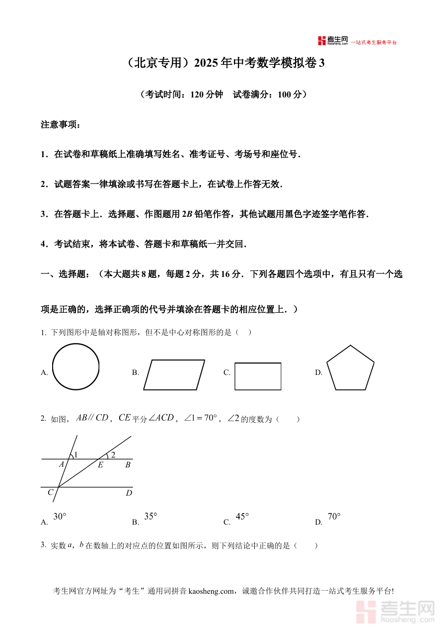 《精品解析:(北京专用)2025年中考数学模拟卷(3)(原卷版)》是针对2025年北京市中考数学科目的专用备考资料,聚焦北京地区中考数学的命题趋势与考查方向,为考生提供贴合本地考试要求的模拟训练载体。该资料依托北京中考数学的命题特点设计,旨在帮助考生提前适应考试环境与题型结构,是中考备考过程中的重要辅助资源。