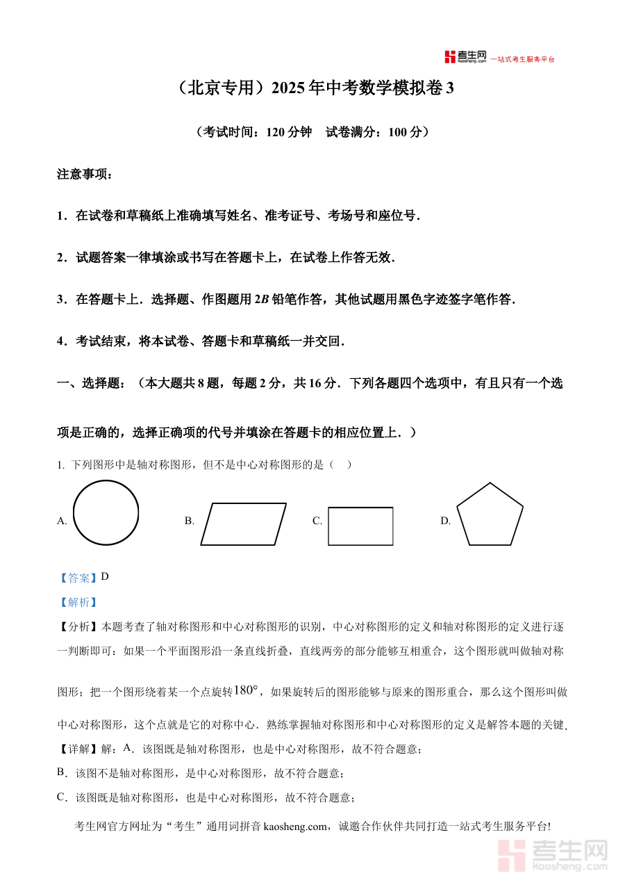《精品解析:(北京专用)2025年中考数学模拟卷(3)(解析版)》是专为2025年北京市中考数学科目打造的针对性备考资料,紧密贴合北京地区中考数学的命题趋势与区域考查特点,为考生提供符合本地考试要求的模拟训练资源。