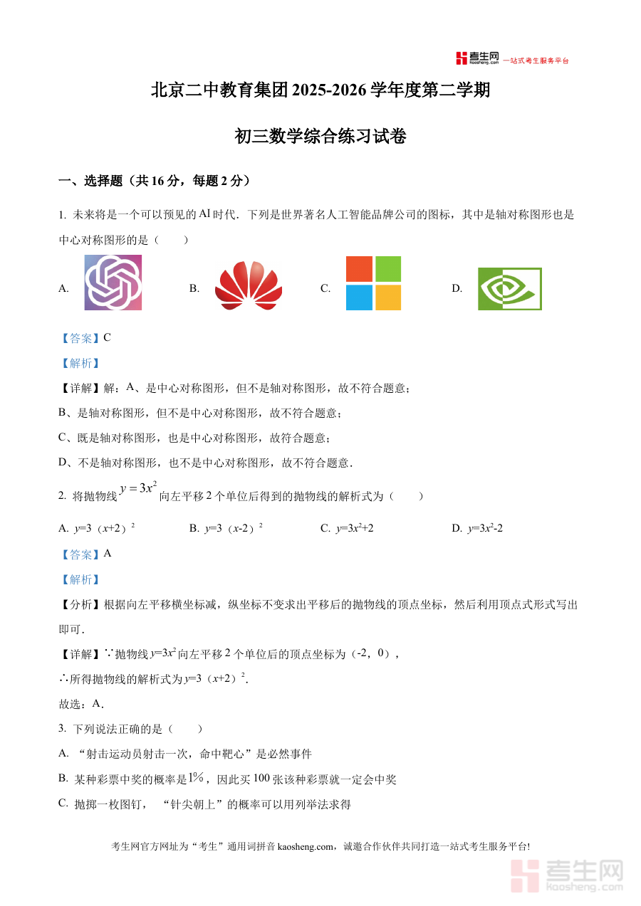 《精品解析:北京市第二中教育集团20252026学年第二学期九年级数学综合练习试卷(解析版)》是针对北京市第二中教育集团范围内,2025-2026学年第二学期九年级学生的数学综合练习类备考资料,依托该教育集团的教学安排与阶段学习目标设计,聚焦九年级数学学科的阶段性知识整合与应用能力考查。