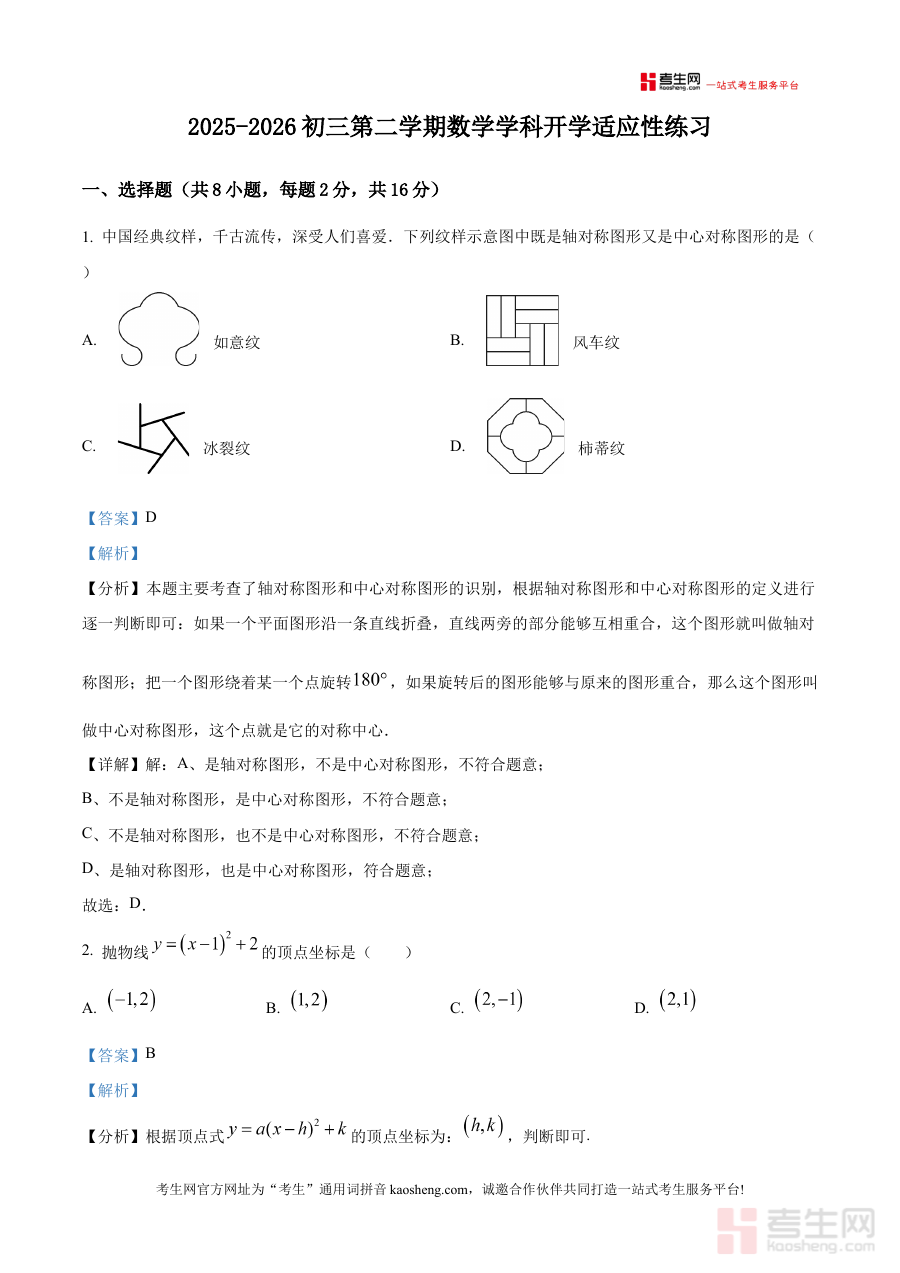 《精品解析:北京师范大学附属中学2025-2026学年九年级下学期学情自测 数学试题(解析版)》是针对北京师范大学附属中学2025-2026学年九年级下学期学情自测设计的数学学科备考资料,结合该学年该阶段的学习进度与学情特点,为学生提供对应自测的详细解析内容,是九年级下学期学生进行阶段性学习巩固与备考准备的重要参考材料。