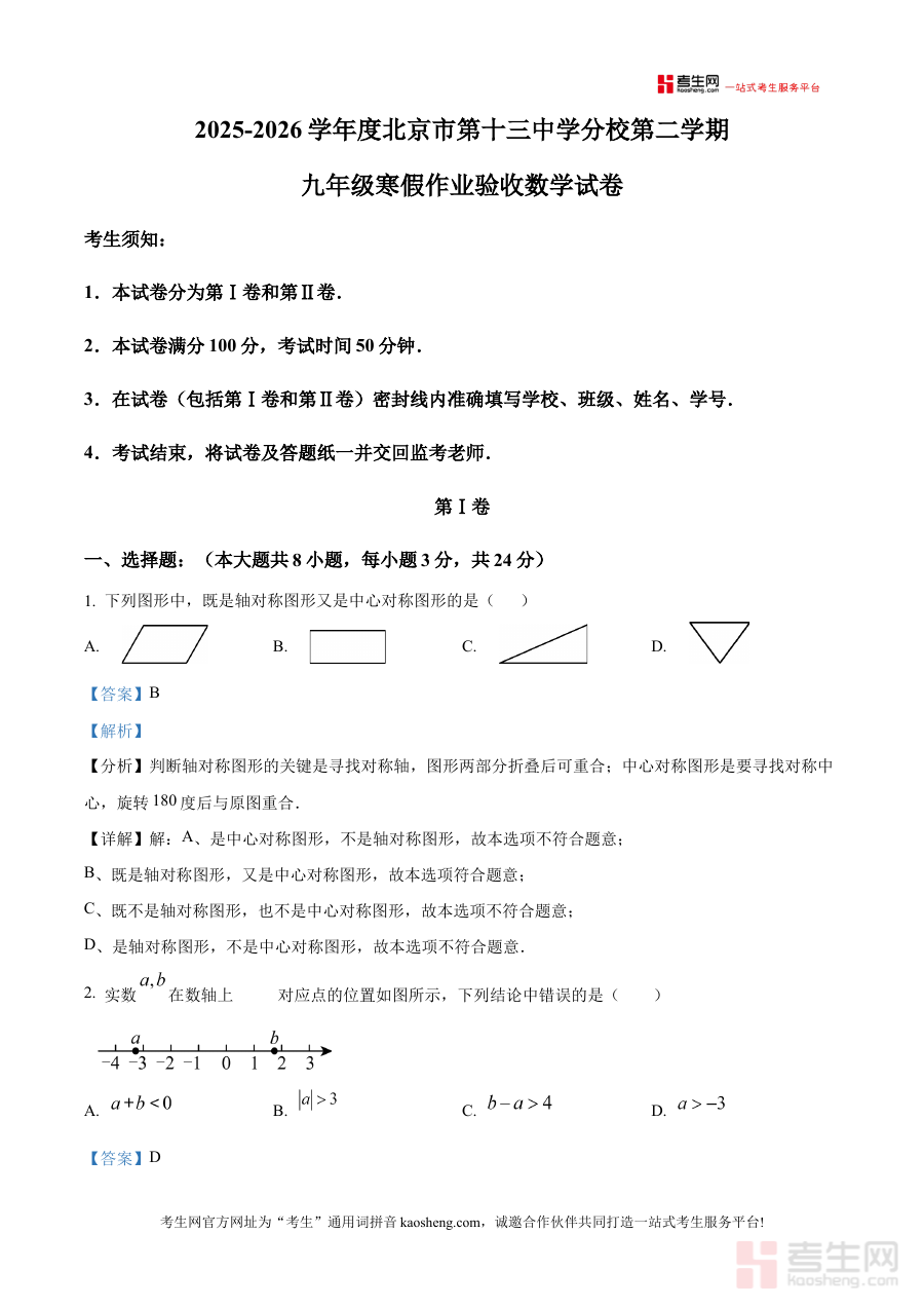 《精品解析:北京第十三中学分校2025-2026学年度第二学期九年级寒假作业验收数学试卷(解析版)》是北京第十三中学分校针对2025-2026学年度第二学期九年级学生设计的数学学科资料,对应该校该学期的寒假作业验收考试需求,属于九年级数学阶段性学习的重要备考资料。该资料以解析版形式呈现,紧密贴合学校内部寒假作业验收考试的具体设置,为使用者提供与考试直接关联的内容支持,具有较强的针对性和实用性。