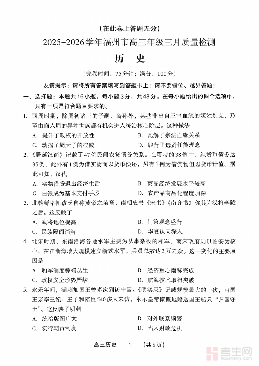 《历史试题:2025-2026学年福州市高三年级三月质量检测》是针对2025-2026学年福州市高三年级学生开展的三月质量检测对应的历史学科试题资料,属于高三历史备考过程中的阶段性检测资料。该资料依托福州市教育教学规划中的阶段检测安排,为高三历史学科的阶段性学习提供标准化的考查载体。