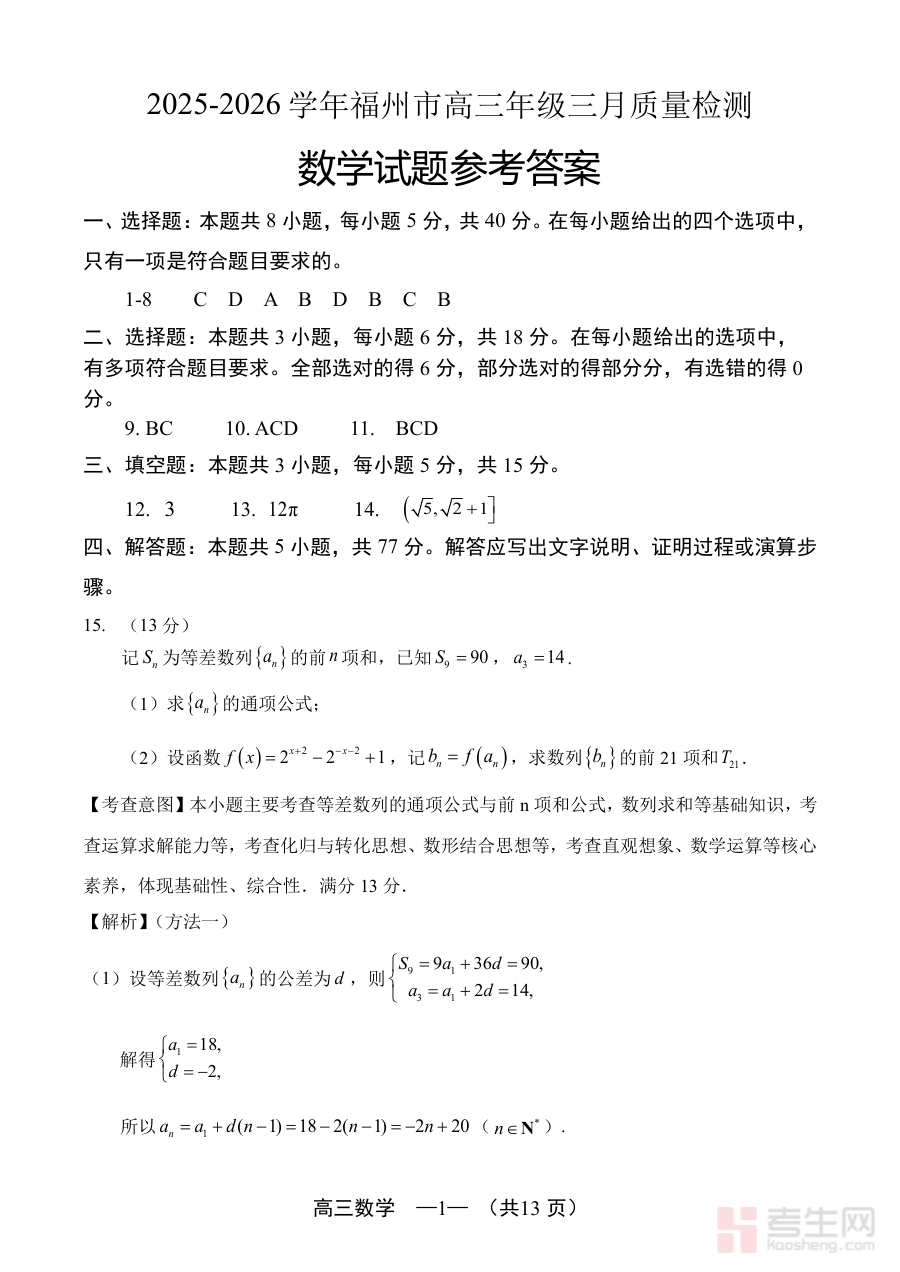 《数学答案:2025-2026学年福州市高三年级三月质量检测》是针对2025至2026学年福州市高三年级三月质量检测数学科目的答案资料,属于该阶段高三数学备考的重要辅助材料。它紧密结合特定学年、地区及考试节点的需求,为使用者提供对应检测的数学答案参考,是高三数学学习过程中阶段性评估与备考的关键资源之一。