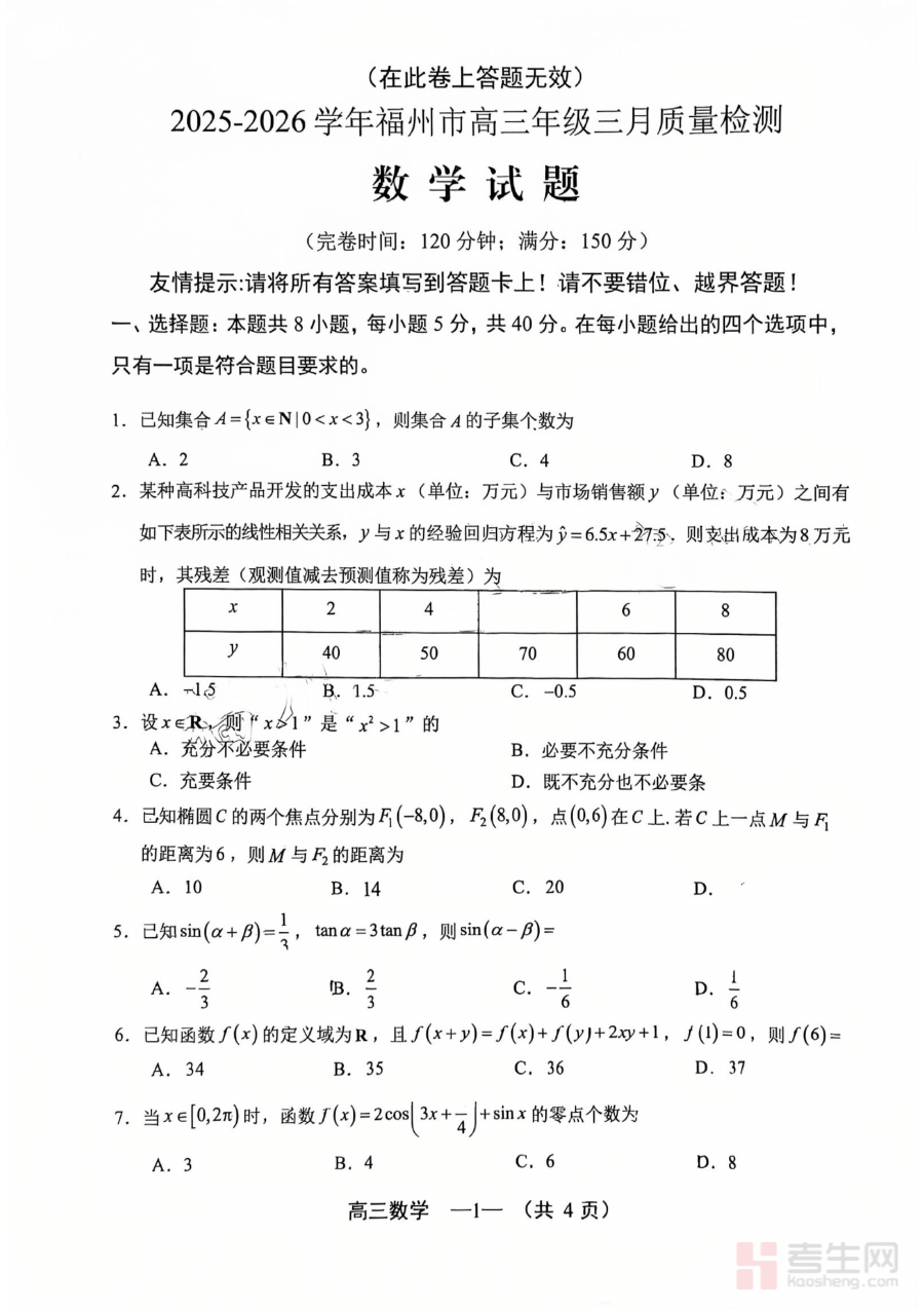 本试题的适用人群主要为2025-2026学年福州市高三年级的学生、数学任课教师以及区域内的教育教研人员。学生可借助该试题进行模拟检测,提前适应区域质量检测的命题风格与考查节奏;教师可通过分析试题结果把握区域教学方向与学生共性问题,优化课堂教学与备考指导策略;教研人员则能依托试题数据开展区域数学教学质量分析与备考策略研究,为整体备考规划提供专业支持,充分体现其在阶段检测与备考规划中的实用价值。