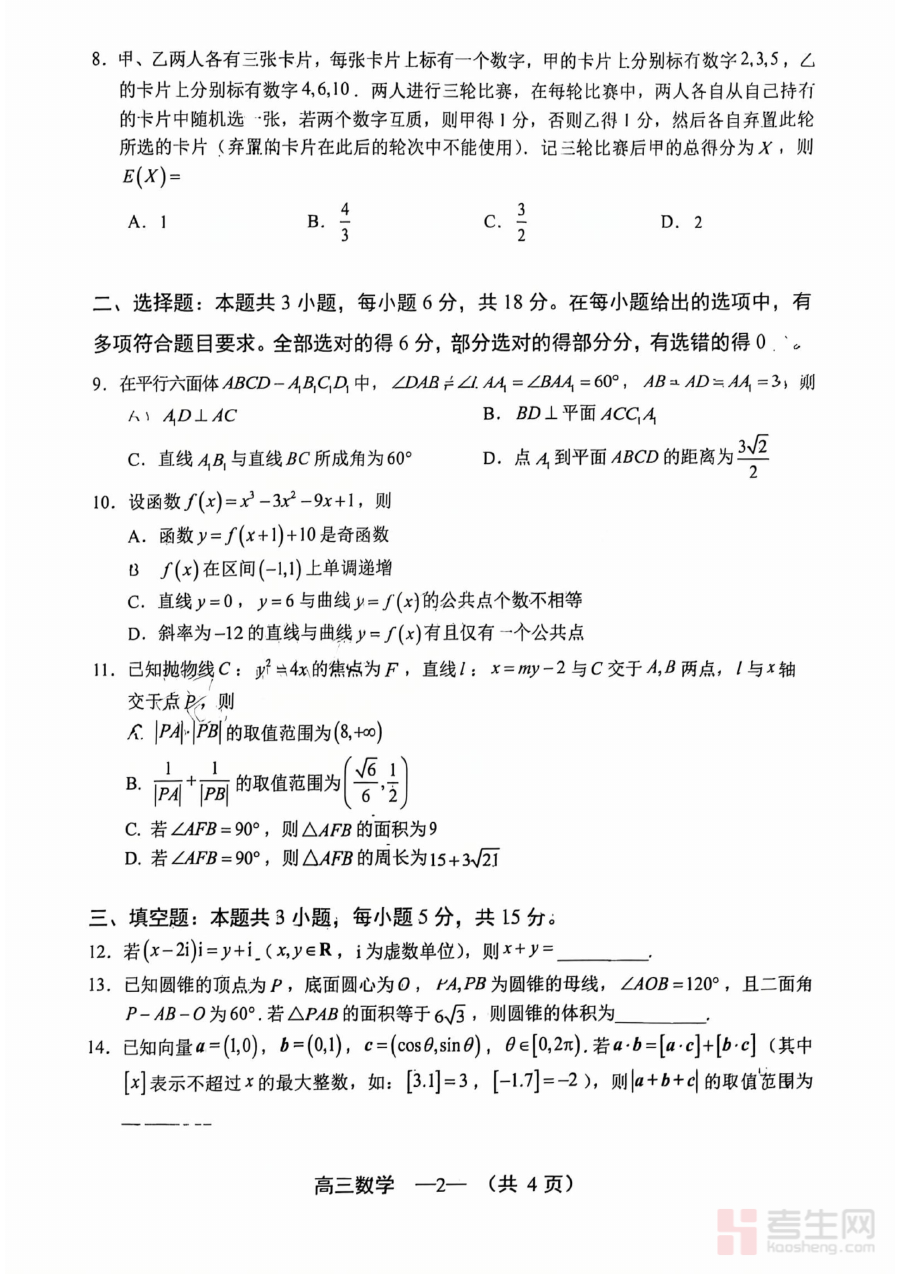 该试题资料的核心用途在于助力高三数学教学与备考工作的精准推进。对于学校和教师而言,它可用于开展阶段性学情诊断,系统了解学生在当前学习阶段的知识掌握情况、能力发展水平及常见问题,为后续教学内容调整、复习重点优化提供客观依据;对于学生个人,它能帮助其进行自我学习评估,明确自身在区域内的学习位置,发现知识薄弱环节,从而更有针对性地制定个人复习计划。