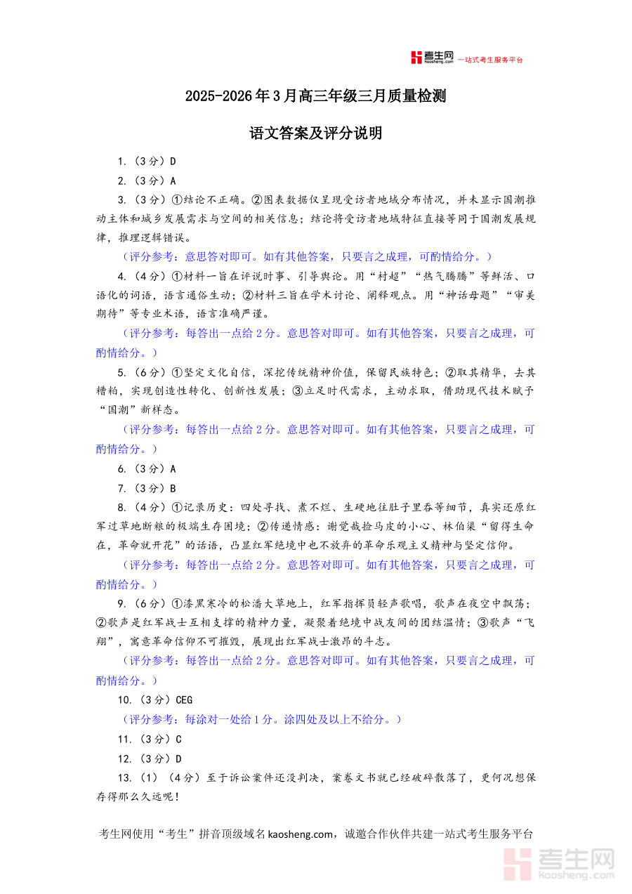 《语文答案:2025-2026学年福州市高三年级三月质量检测》是2025-2026学年福州市教育系统针对高三年级组织的三月质量检测语文科目的官方配套答案资料,属于福州地区高三阶段关键的区域性阶段性质量评估资源。该资料与本次质量检测试卷内容完全对应,为使用者提供了该次检测语文科目的权威作答参考标准,是参与此次检测的学生、教师及教研人员获取准确作答依据的核心载体。