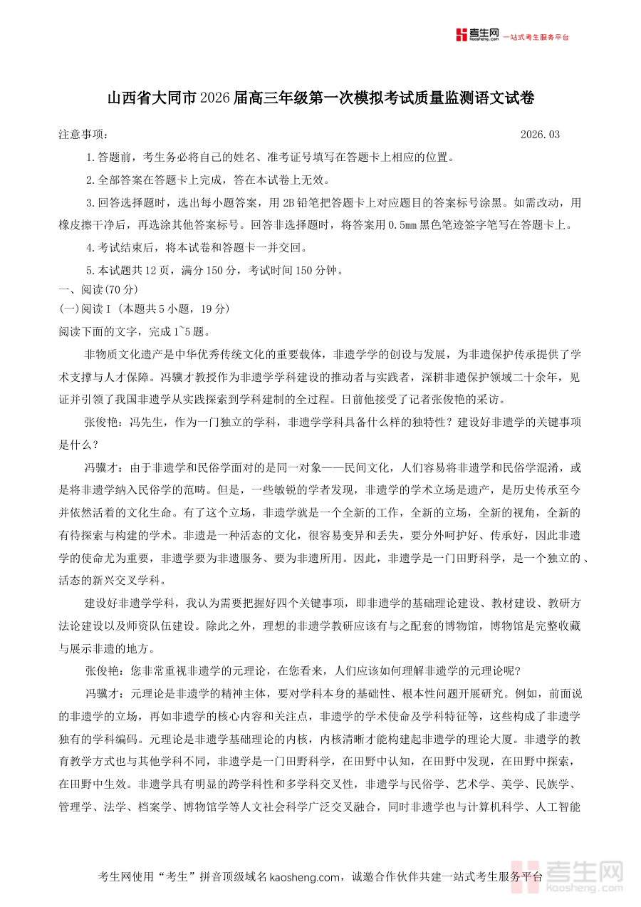 《山西省大同市2026届高三第一次模拟考试质量监测语文试卷(含答案)》是面向山西省大同市2026届高三学生推出的首次语文模拟考试质量监测资料,涵盖完整试卷及对应参考答案。该资料严格遵循当地高三语文教学大纲与考试评价标准,旨在为学生提供符合阶段学习进度的标准化检测工具,助力学生提前适应高考语文的考查形式与节奏。