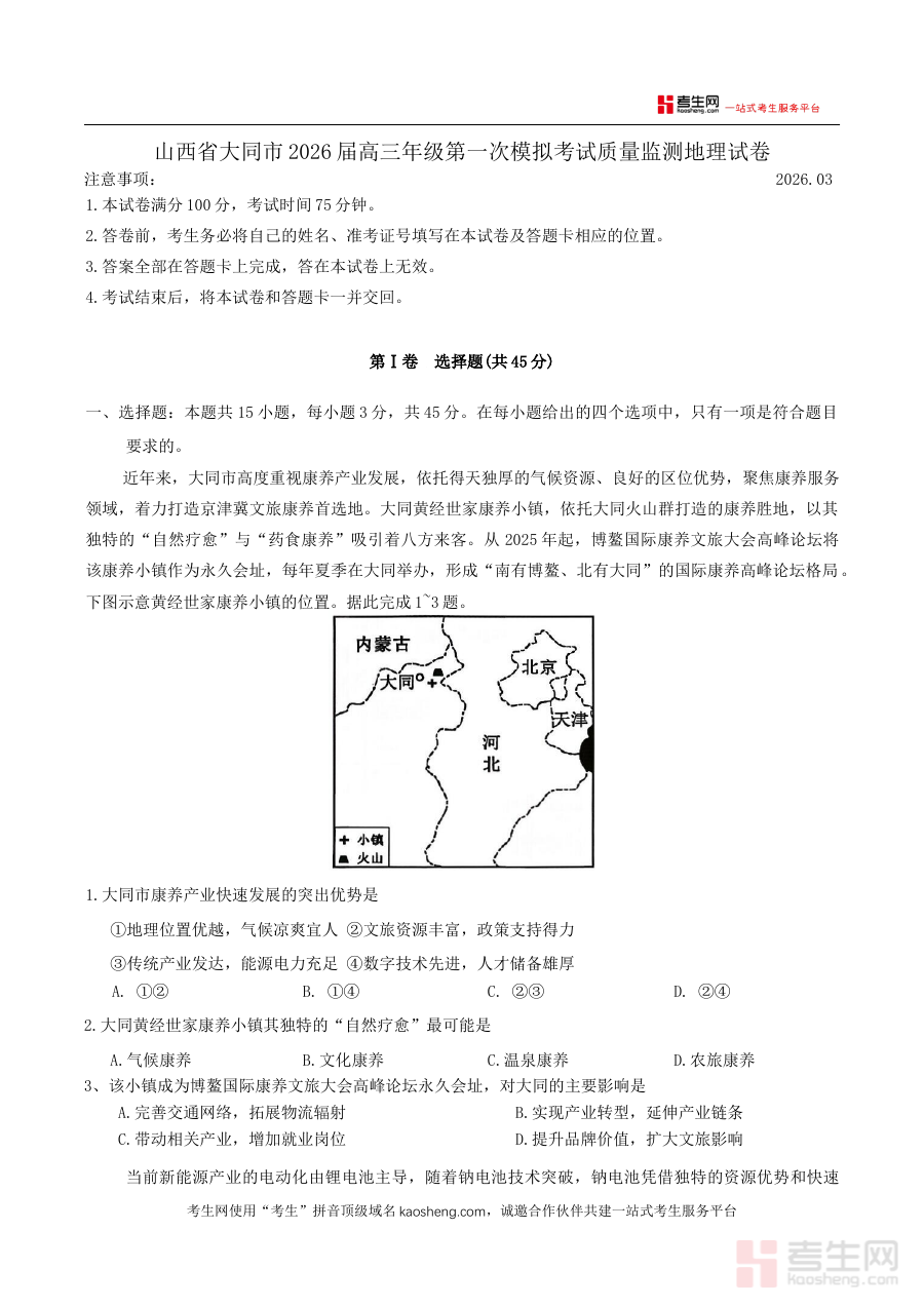 《山西省大同市2026届高三年级第一次模拟考试质量监测地理试卷(含答案)》是针对山西省大同市2026届高三学生设计的地理学科模拟考试资料,包含完整试卷及配套参考答案,属于高三阶段首轮模拟监测类备考材料,紧密贴合本地高三地理教学进度与区域考试要求,为学生提供符合本地考情的实战训练载体。