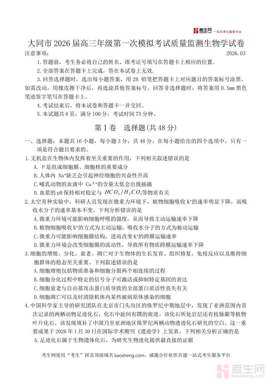 该资料主要适用于山西省大同市2026届高三年级的全体学生,同时也为生物学科教师提供了阶段教学质量评估的有效依据,以及为备考指导团队制定区域化复习方案提供素材支持。其附带的答案部分能够帮助使用者及时验证作答准确性,加深对生物学知识点的理解与应用,对于推动高三生物学备考工作的高效开展具有重要价值。
