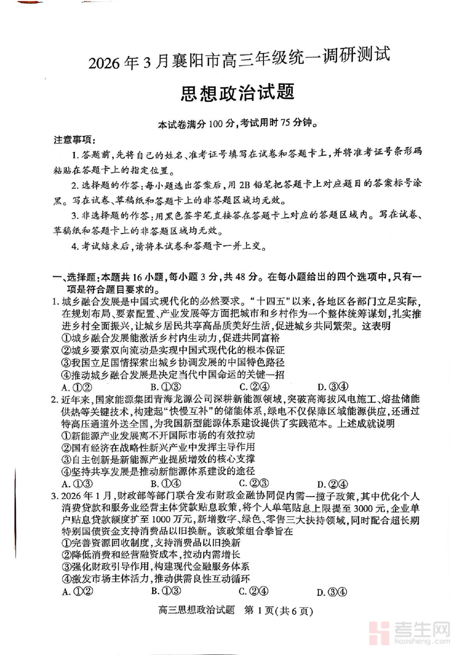 《2026届湖北省襄阳市高三统一调研测试思想政治试题(含答案)》是针对2026届湖北省襄阳市高三学生的统一调研测试类资料,属于区域性高三阶段的重要检测资源,能够为该地区高三学生的思想政治学科学习提供阶段性参考依据,是适配本地教学进度与考试要求的针对性备考材料。