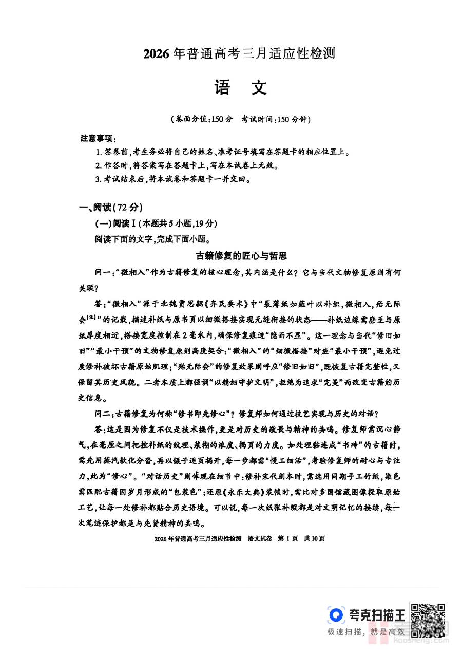 该资料适用于新疆2026届高三年级语文考生及相关教学工作者。对于考生而言,参与此次适应性检测有助于及时发现学习漏洞,调整复习重点,提升备考的针对性与有效性;对于教师而言,它可作为教学效果评估的重要参考,辅助优化教学策略与复习计划。整体来看,此资料在高考备考的关键阶段具有重要的指导价值与实践意义。
